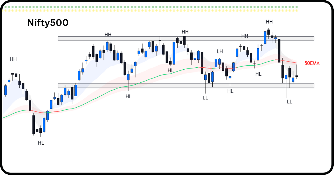 Nifty500 failed to sustain its recent breakout and entered a significant corrective phase. The failed breakout followed by a deep ‘V-shaped’ decline has altered the short-term market structure. The index is back into the consolidation phase now.