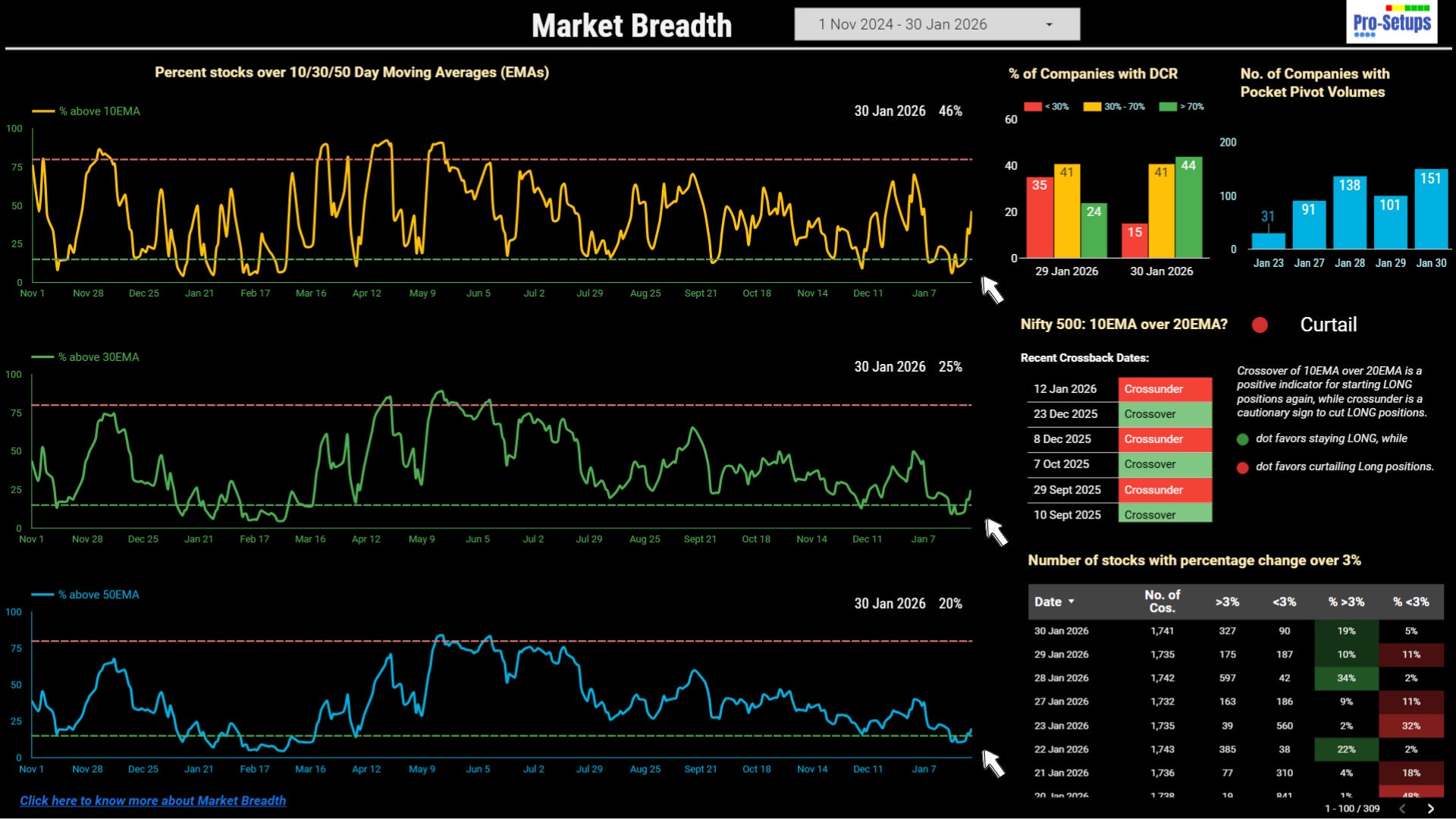 Nifty500’s 10EMA crossed under its 20EMA on 12th January triggering a ‘Curtailing’ signal that suggests reduction or closure of existing long positions.