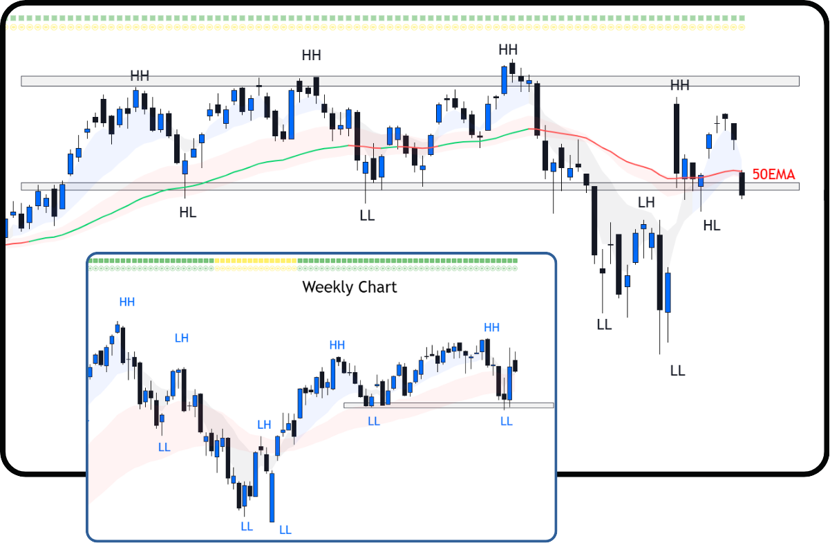 Bullish Momentum weakened again: Nifty 500’s 10EMA briefly crossed back above the 20EMA, initially suggesting a spark of recovery. However, this momentum proved short-lived following Friday’s sharp rejection.