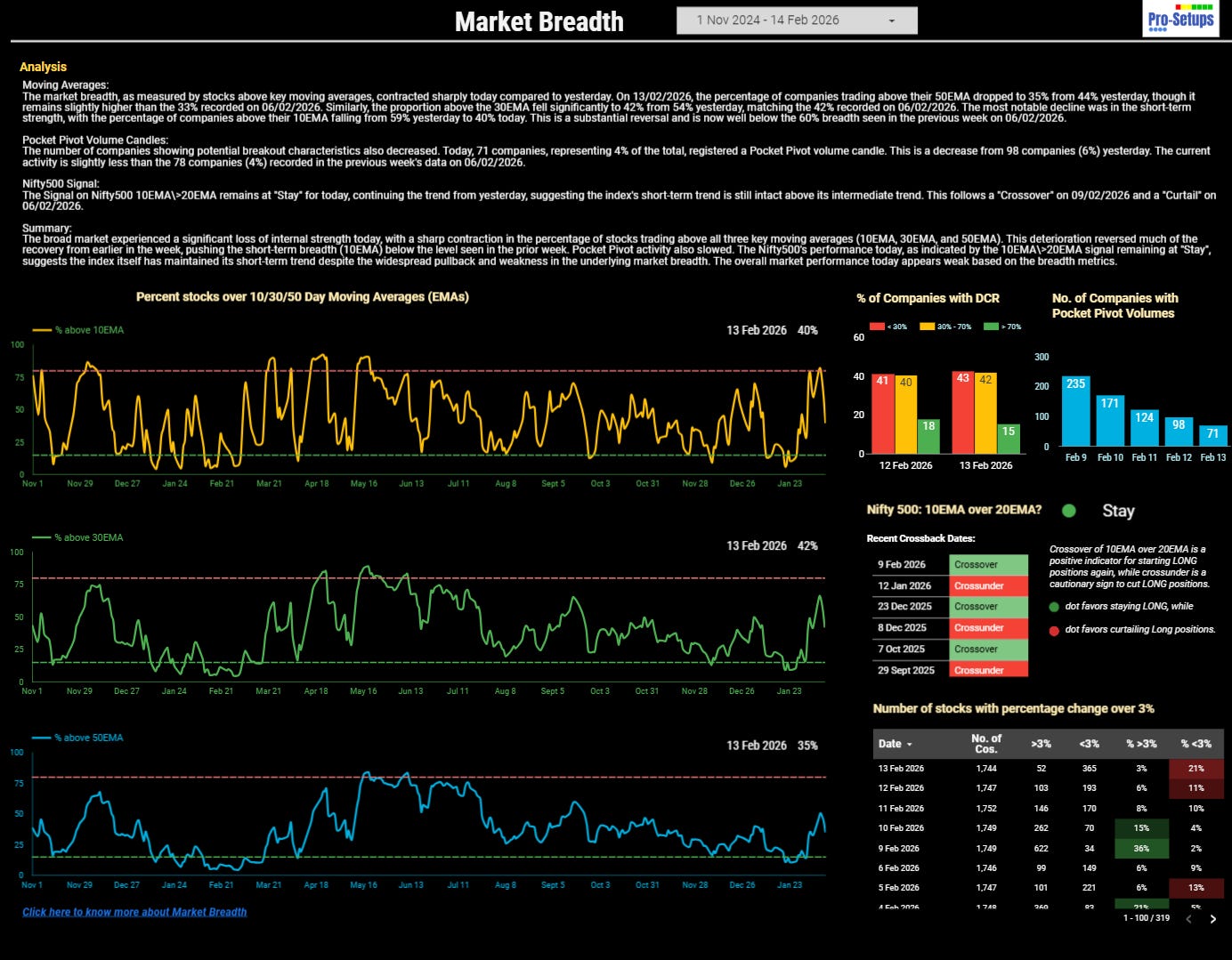Although the week started with a positive bias, sentiment was crushed by global concerns regarding AI-led disruptions, triggering a brutal sell-off in IT stocks. Heavyweights such as TCS, Infosys, and Wipro hit fresh 52-week lows. Consequently, the Nifty500 significantly weakened its short-term structure after failing to sustain above its 50EMA. While the Nifty 500’s 10EMA technically crossed above its 20EMA on February 9, a bearish alignment persists as the 20EMA remains below a downward-sloping 50EMA. A true, sustainable recovery will only be confirmed once the index decisively reclaims and sustains above the 50EMA, achieving a bullish alignment where the 10EMA>20EMA>50EMA. Until then, the market is likely to remain in a choppy, news-driven consolidation phase.