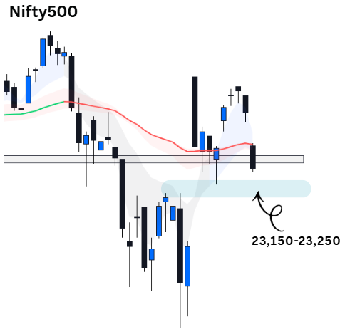Critical Support Zone: The index is currently resting near the 23,150-23,250 demand zone (previous week’s swing low), which has repeatedly acted as support zone previously.