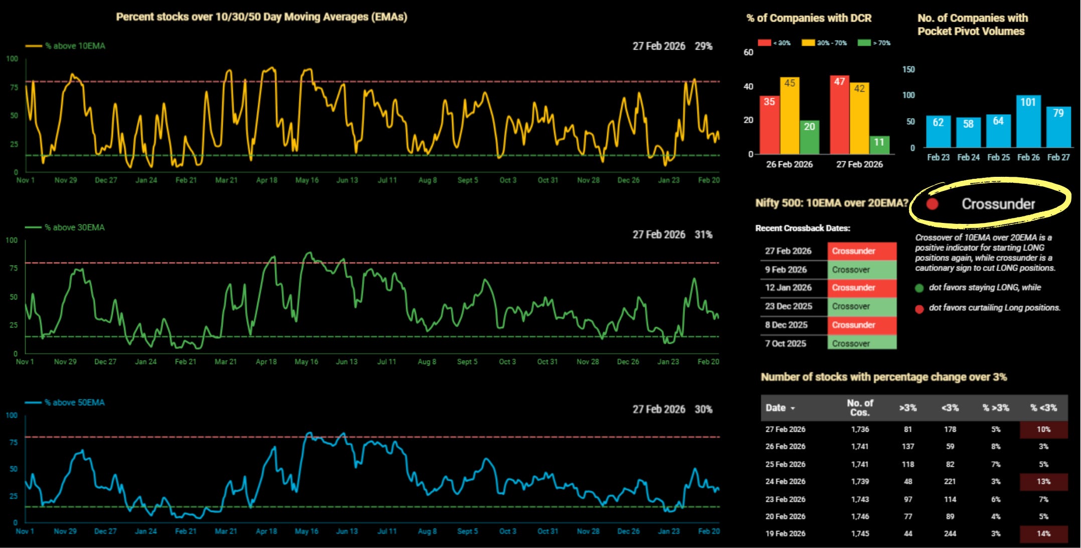 Nifty500’s 10EMA crossed under its 20EMA on 27th February triggering a ‘Caution’ signal that suggests curtailing long positions.