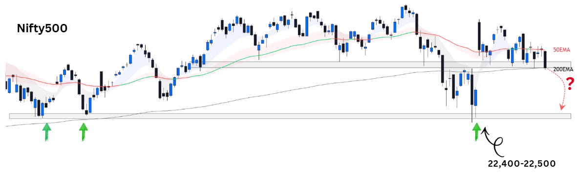 Testing the 200EMA: Nifty500 ended the week practically identical to its 200EMA, which serves as a vital structural floor. It is also a crucial demand zone as was identified in the previous newsletters too. A sustained hold here would signal a successful defense by long-term investors. Any further weakness would likely trigger accelerated selling toward the 22,400-22,500 levels.