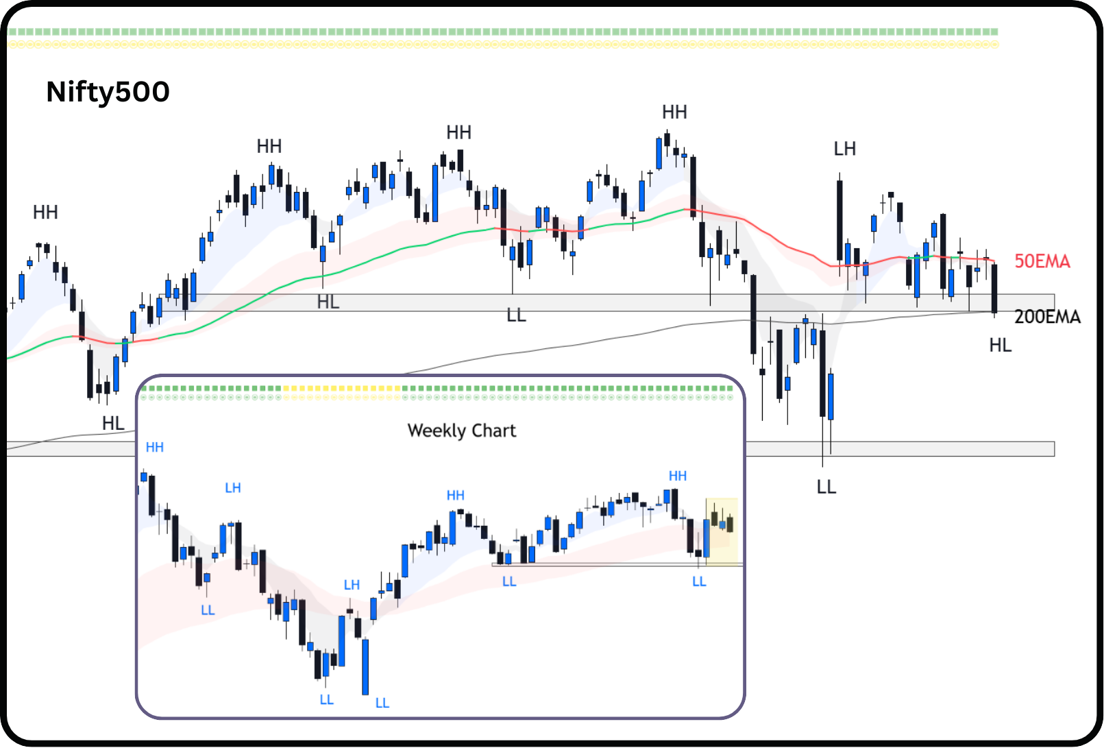 On weekly chart, Nifty 500 continues to trade within a long-term consolidation range. There is a clear loss of upward momentum but not a full breakdown of the primary long-term trend.