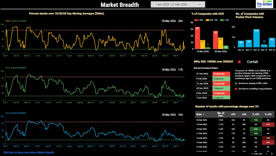 Structural Health: Currently, only 16% of stocks are trading above their 50EMA. Since this is significantly below the 50% threshold, the market lacks structural strength. The dominant trend remains bearish, with the ‘Curtail’ signal on the Nifty500 (10EMA < 20EMA) confirming that selling pressure persists at higher levels.