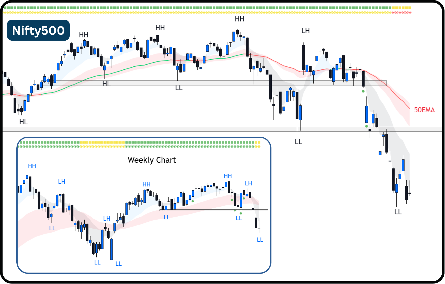 Establishment of Lower Low (LL): Nifty500’s recent price action has established a fresh Lower Low (LL).