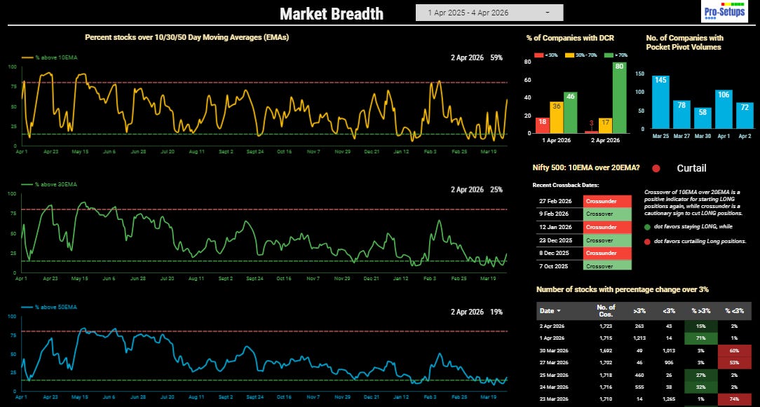 The Nifty 500 is currently witnessing a notable momentum shift in short-term participation. At present, 59% of stocks are trading above their 10EMA, a sharp climb over the 19% seen a week ago on March 28. This surge suggests an early improvement in market sentiment, where stocks are beginning to reclaim near-term levels even as the index price remains lower than its previous weekly close. The medium-term health is also showing signs of life, with 30EMA participation rising to 25%, compared to 14% last week. This indicates that while the broader trend has been under pressure, a recovery is attempting to take root from the bottom up.