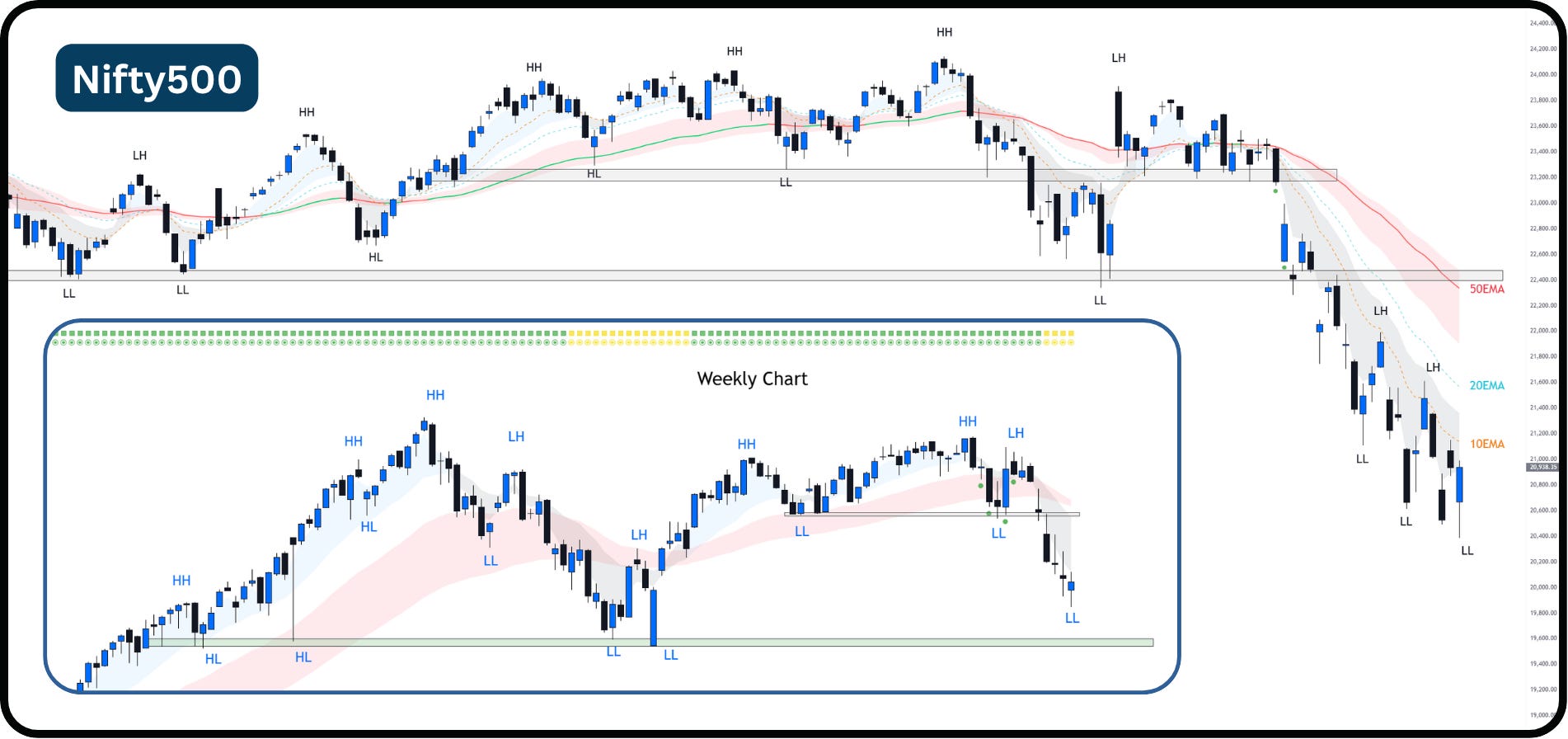 Strong Resistance from 10EMA: The Nifty500 continues to show strong downward momentum, repeatedly facing resistance near the falling 10EMA..