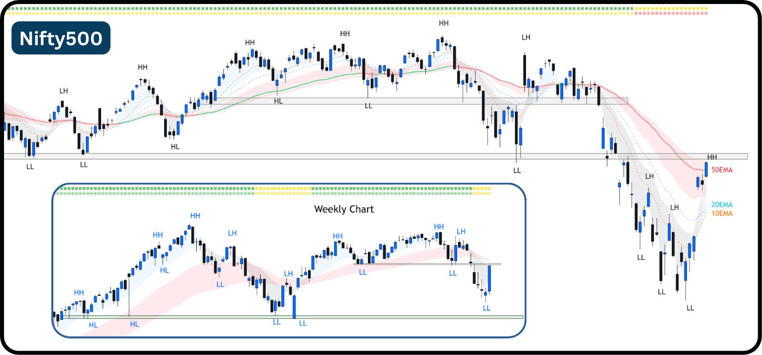 While the market breadth has improved notably, the Sharp V shaped recovery last week and as Nifty500 is just around the previous Support turned Resistance zone, some “cooling off” can be expected in the early part of next week. Potentially, the market may do a retracement, clock a Higher Low, before attempting to take over this resistance levels.