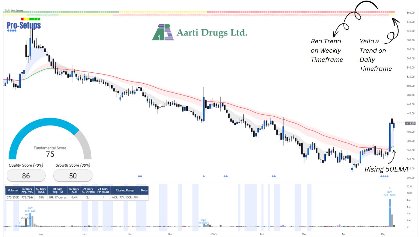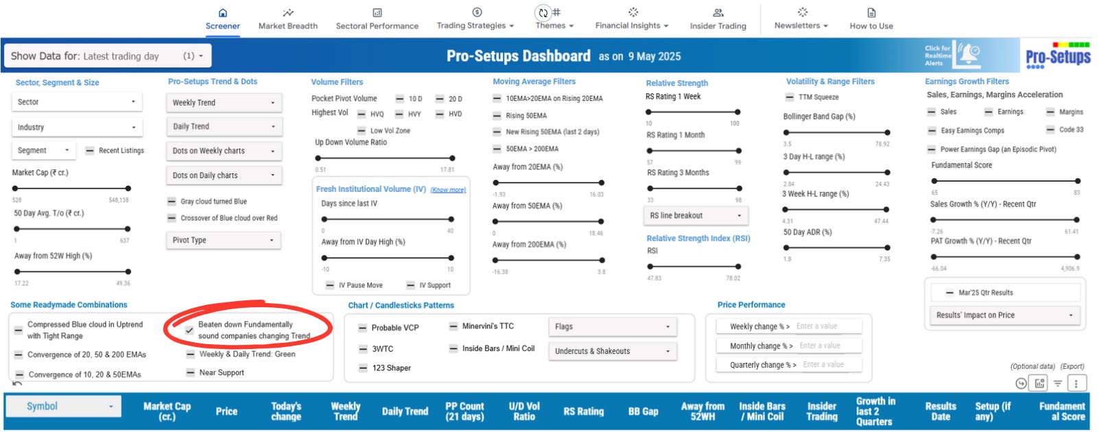 One of the readymade filters that we have in our Pro-Setups Dashboard is to scan for companies that are beaten down, but are now on the verge of changing trend. The core idea behind this filter is to give us a headstart in identifying solid companies at the cusp of a turnaround. Entering such stocks early-when the broader market is still skeptical can offer attractive risk-reward opportunities.
