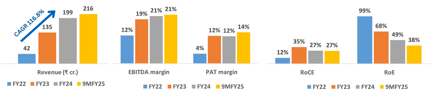 Financially, Borana has delivered outstanding results, achieving a 117% revenue CAGR from FY22 to FY24, with EBITDA margins rising from 12% to 21% and PAT margins from 4% to 12%, alongside consistently strong ROE and ROCE. However, its grey fabric is a commodity with no pricing power or brand moat. And its margins rely heavily on Gujarat’s subsidies (₹7.5 crore in FY24 alone), so any reduction in these benefits could quickly erode profitability.