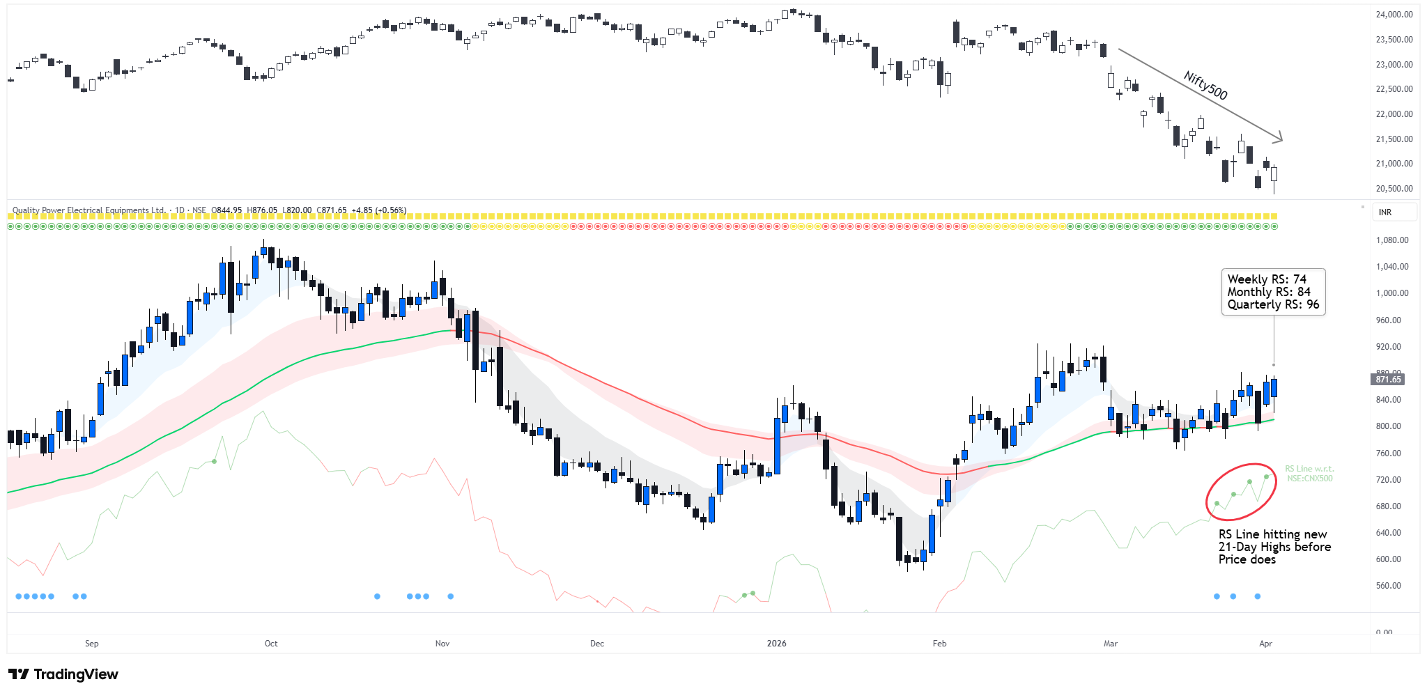 On 2nd April, QPOWER showed strong relative strength across multiple timeframes, even as the broader market was weak:
