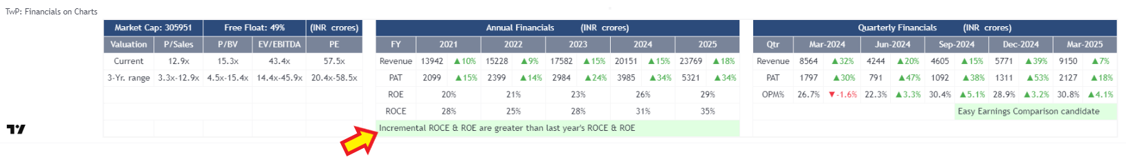 Our ‘Financials on Charts’ indicator on TradingView is designed to give you Key Notes on companies. ‘Incremental ROCE & ROE greater than last year’s ROCE & ROE’ is one of those notes, in addition to Easy Earnings Comparison, Code 33, Earnings Acceleration etc.