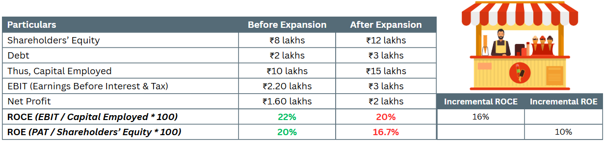To understand incremental ROCE and ROE, let’s use the story of a neighborhood ice cream shop. The owner decides to open a second shop with an investment of ₹5 lakh (₹4 lakhs from equity and ₹1 lakh from Debt).