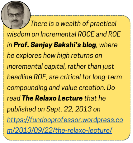 So, if a company shows traditional ROCE of 20% but incremental ROCE of 30%, it indicates the management is deploying new capital more efficiently than the existing business, suggesting accelerating wealth creation potential. But if the same company has incremental ROCE of 14%, it erodes shareholders’ value.