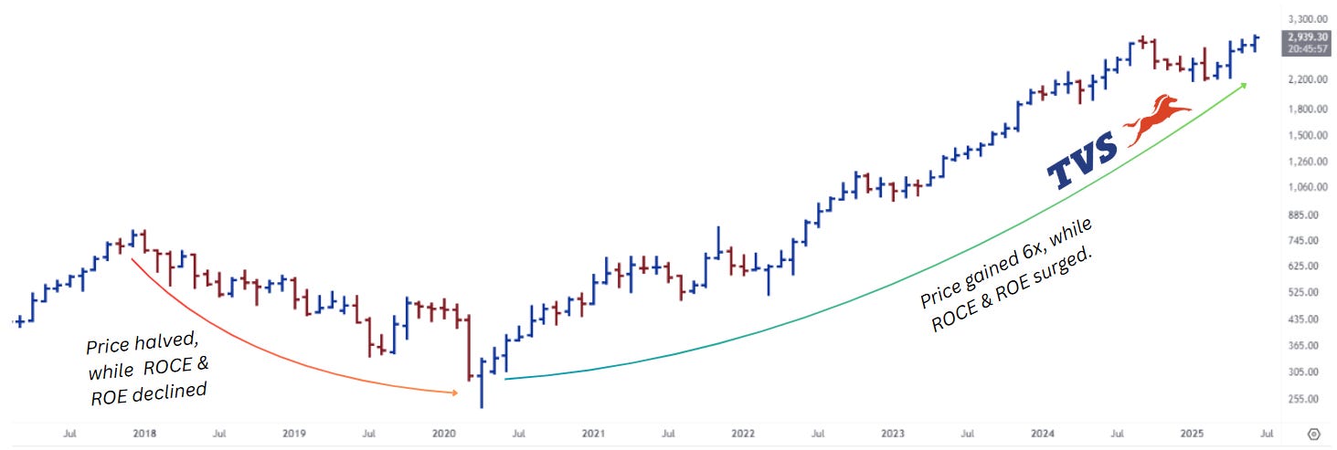 TVS Motor Company’s (NSE: TVSMOTOR) performance between FY18 and FY25 highlights the power of incremental ROCE and ROE as early indicators of business momentum and stock price action.