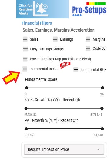 With Pro-Setups Dashboard, you can also scan for stocks that have Incremental ROCE and ROE higher than last year’s ROCE and ROE.