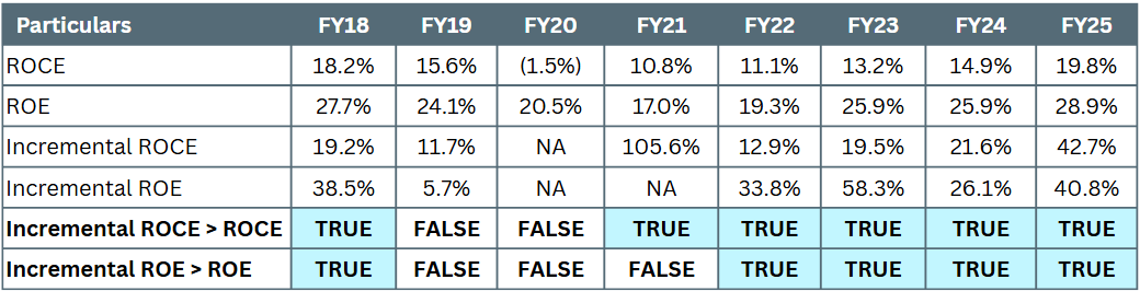 The turnaround began in FY21, with ROCE and ROE rebounding sharply - reaching 19.8% and 28.9% by FY25. Incremental ROCE and ROE consistently exceeded headline metrics, signaling highly effective capital deployment. The market responded with a dramatic rerating with its price soaring more than sixfold from its 2020 lows.