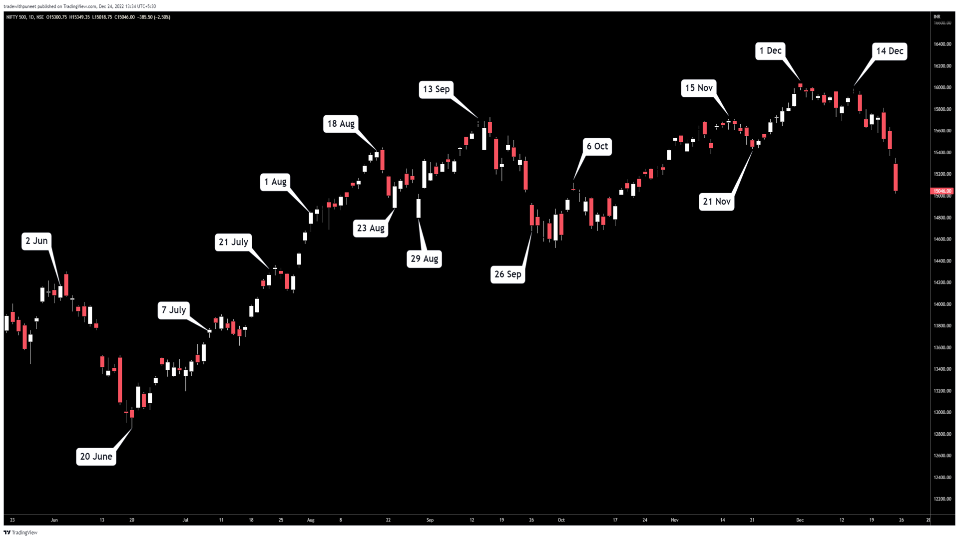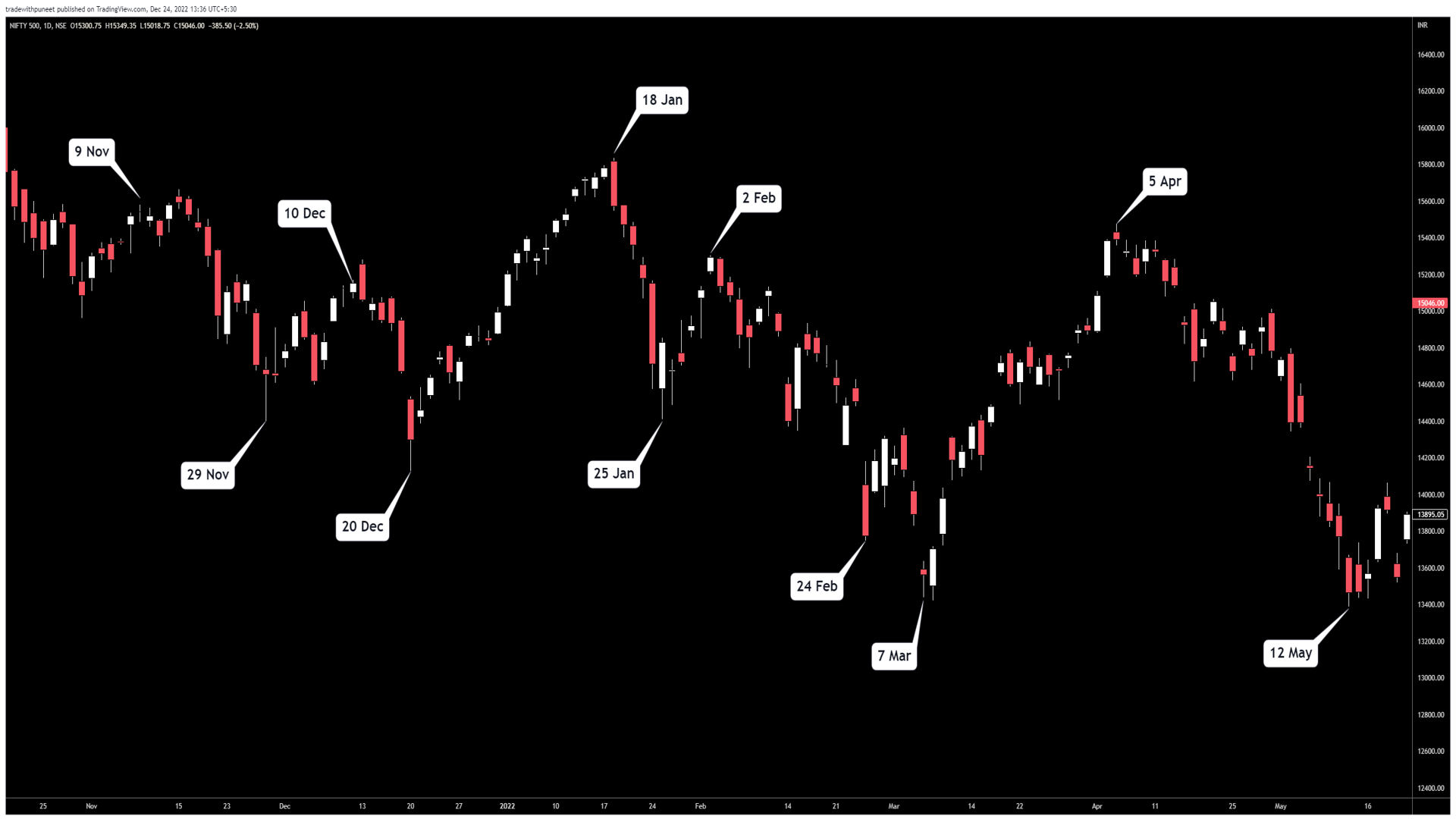 Following is the chart of Nifty500 for the last year, (divided into two parts - Dec 2021 - May 2022, and May 2022 - Dec 2022), marking the dates of turns. Then we have the Market Breadth page from our Dashboard, marking the same dates on the charts.