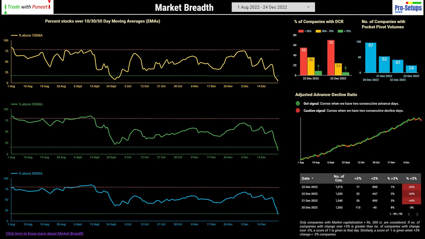 I am not saying that the Market Breadth page is enough for us to decide whether to exit completely or partially. Let’s say that when you reach the extreme overbought levels, your breakouts will start failing, the DCR data will start showing a higher percentage of stocks with DCR <30%, number of pocket pivot signals will start falling compared to previous days. Knowledge of certain candlesticks can also help in analysis. There will be a breakdown of 10 or 20EMAs, a breakdown of trendlines on shorter timeframes, or you will start noticing the first lower high, etc. That will be the time to consider the complete exit or booking majority gains or stop taking new long entries or going short.
