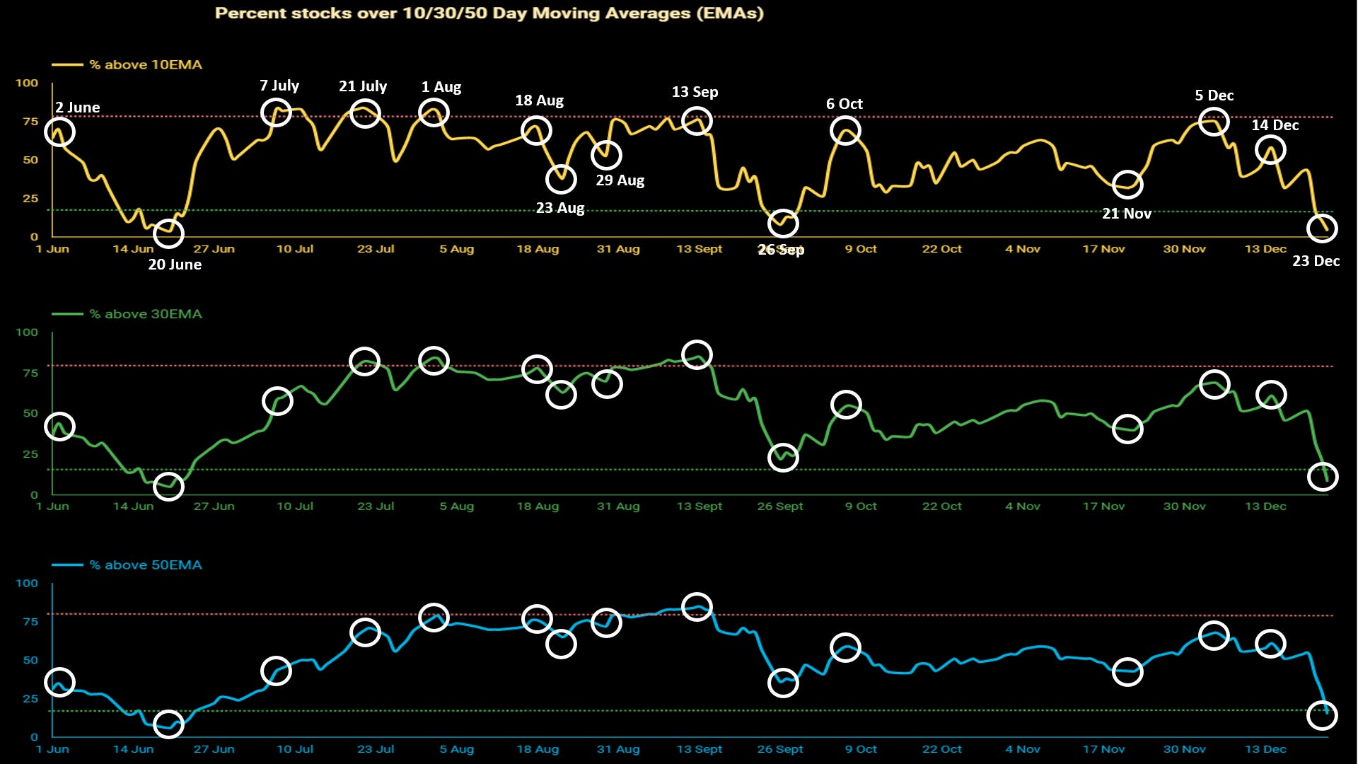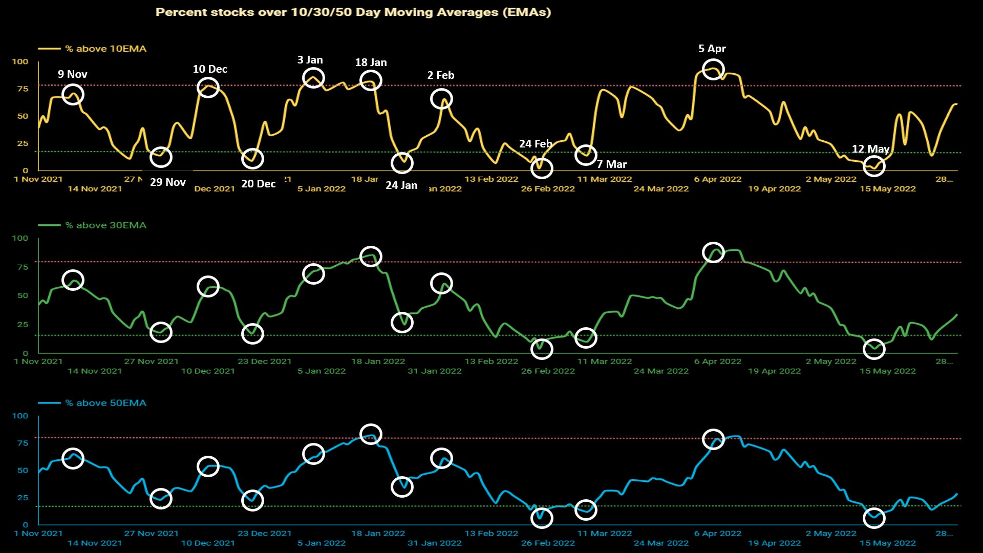 The Market Breadth page in our Dashboard has charts that show the percentage of stocks above 10EMA, 30EMA, & 50EMA, along with certain other data.
