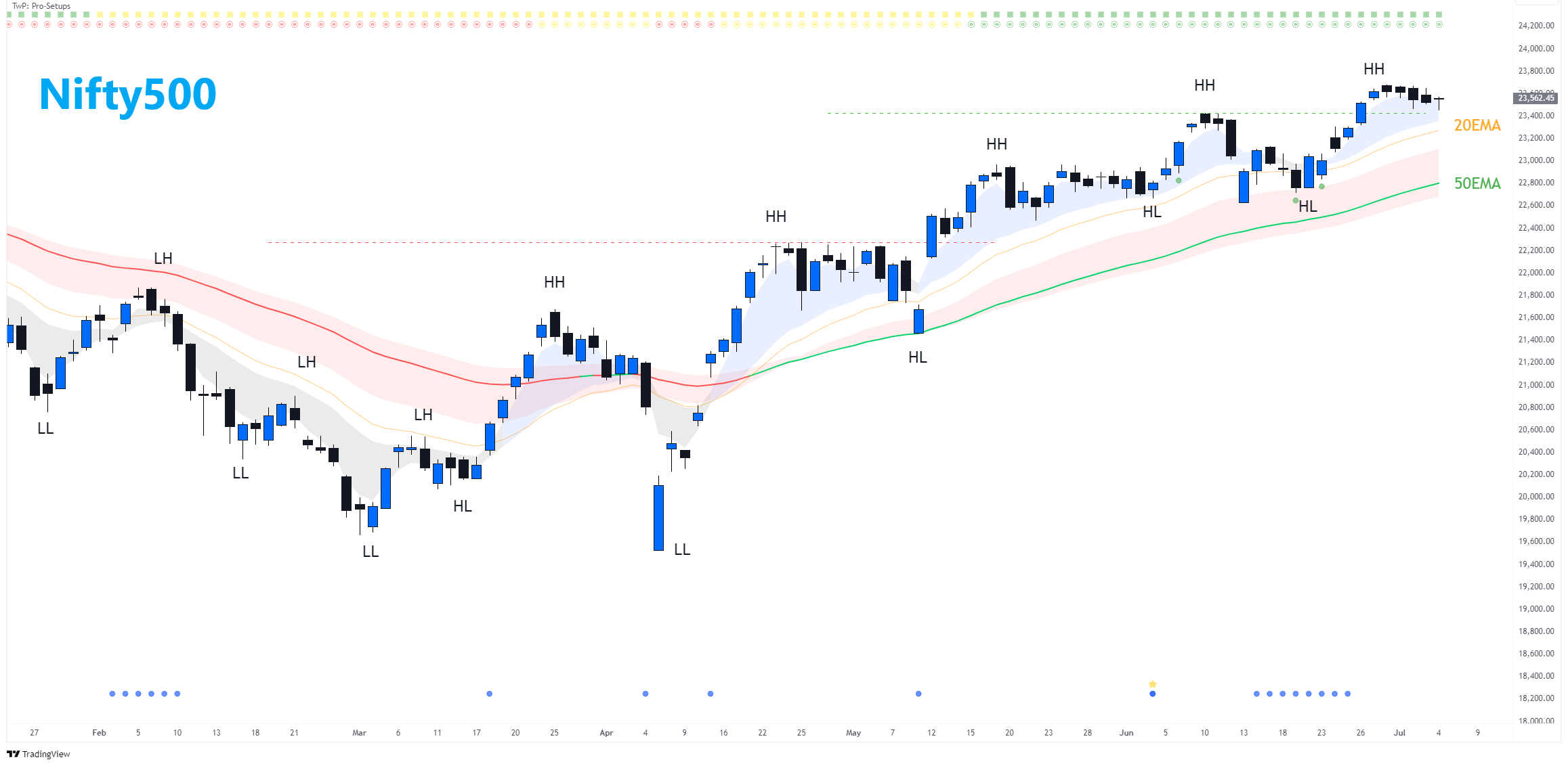 A clear majority of stocks continue to trade above their short and medium-term EMAs, signaling broad-based market strength. While the market is not yet in the overbought zone, just a few more days of upward movement could push it into that territory. At that point, swing traders may start locking in profits, which could lead to short-term pullbacks.