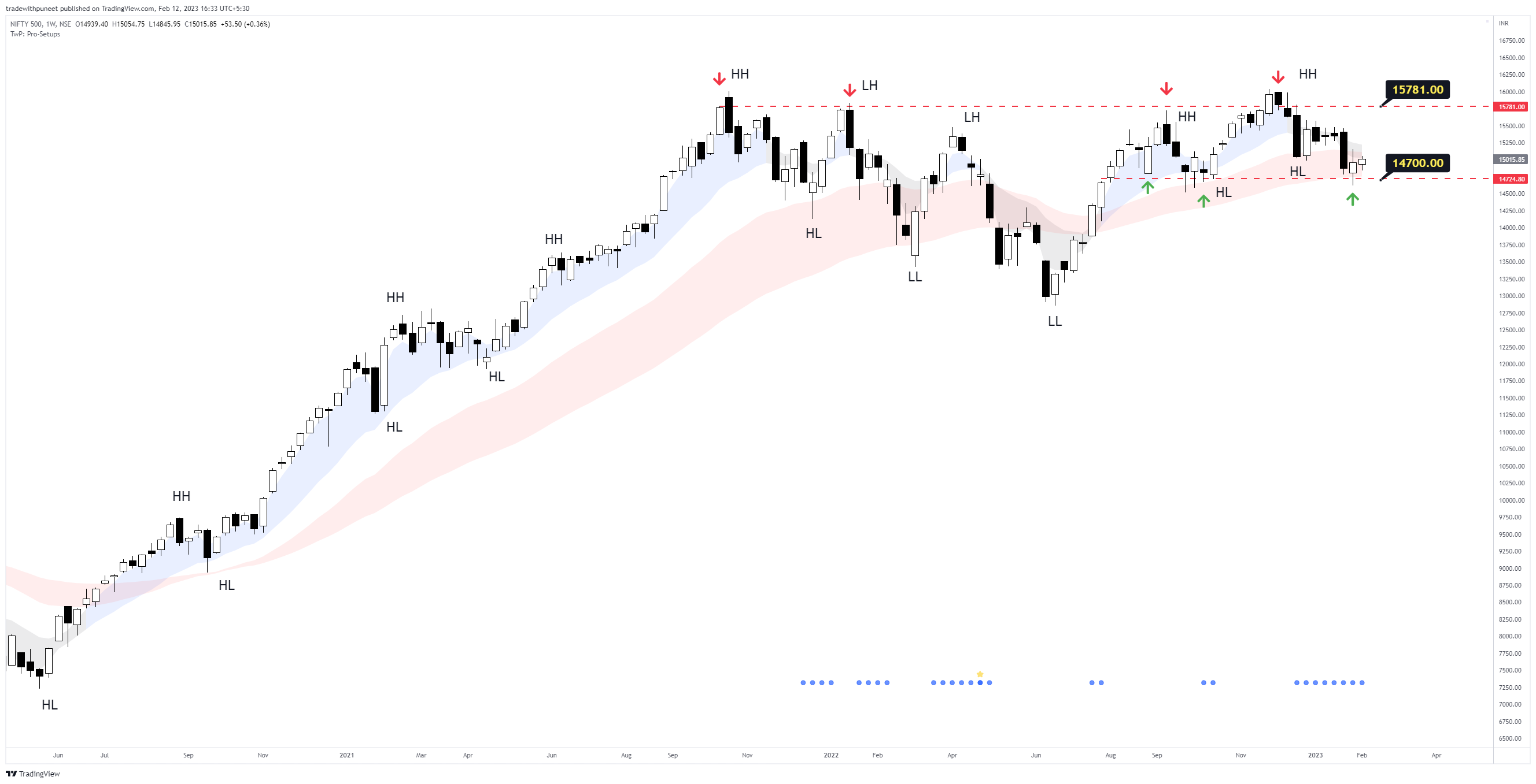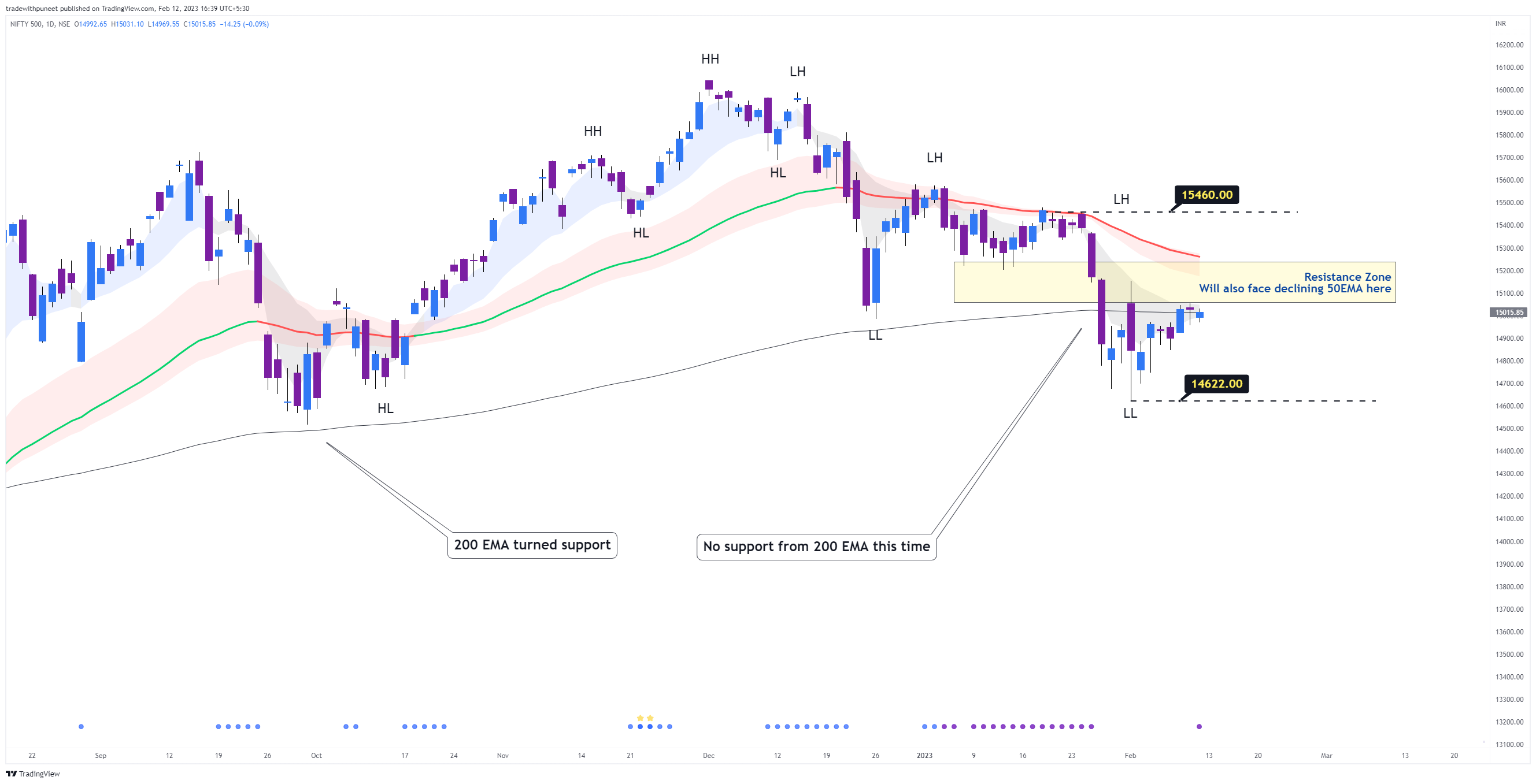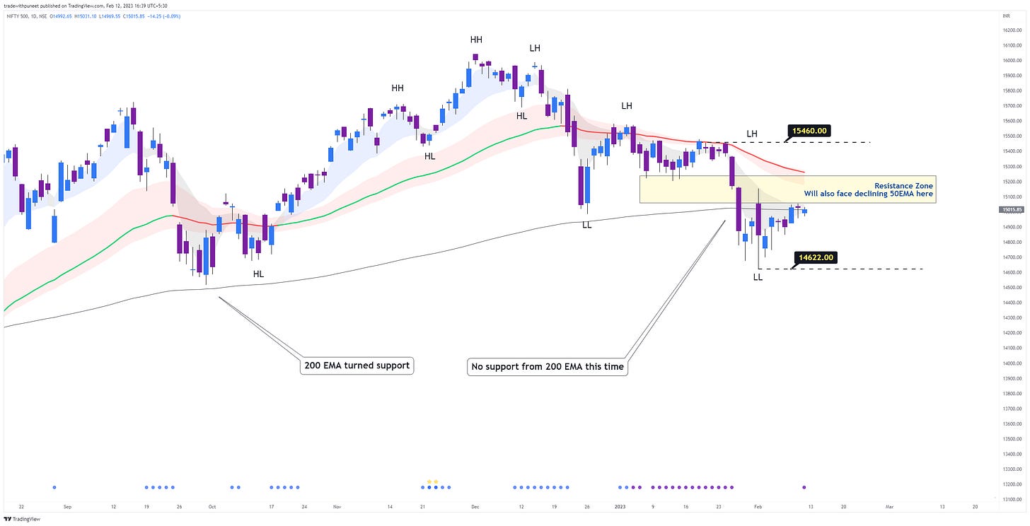 We are sitting on 200EMA. Once we are able to reclaim the 200EMA, the immediate resistance will be the declining 50EMA. These are not magic lines, but they’re important because traders worldwide scan and take action based on these lines. Once that is also done, we should be comfortably breaking the previous lower high of 15460.