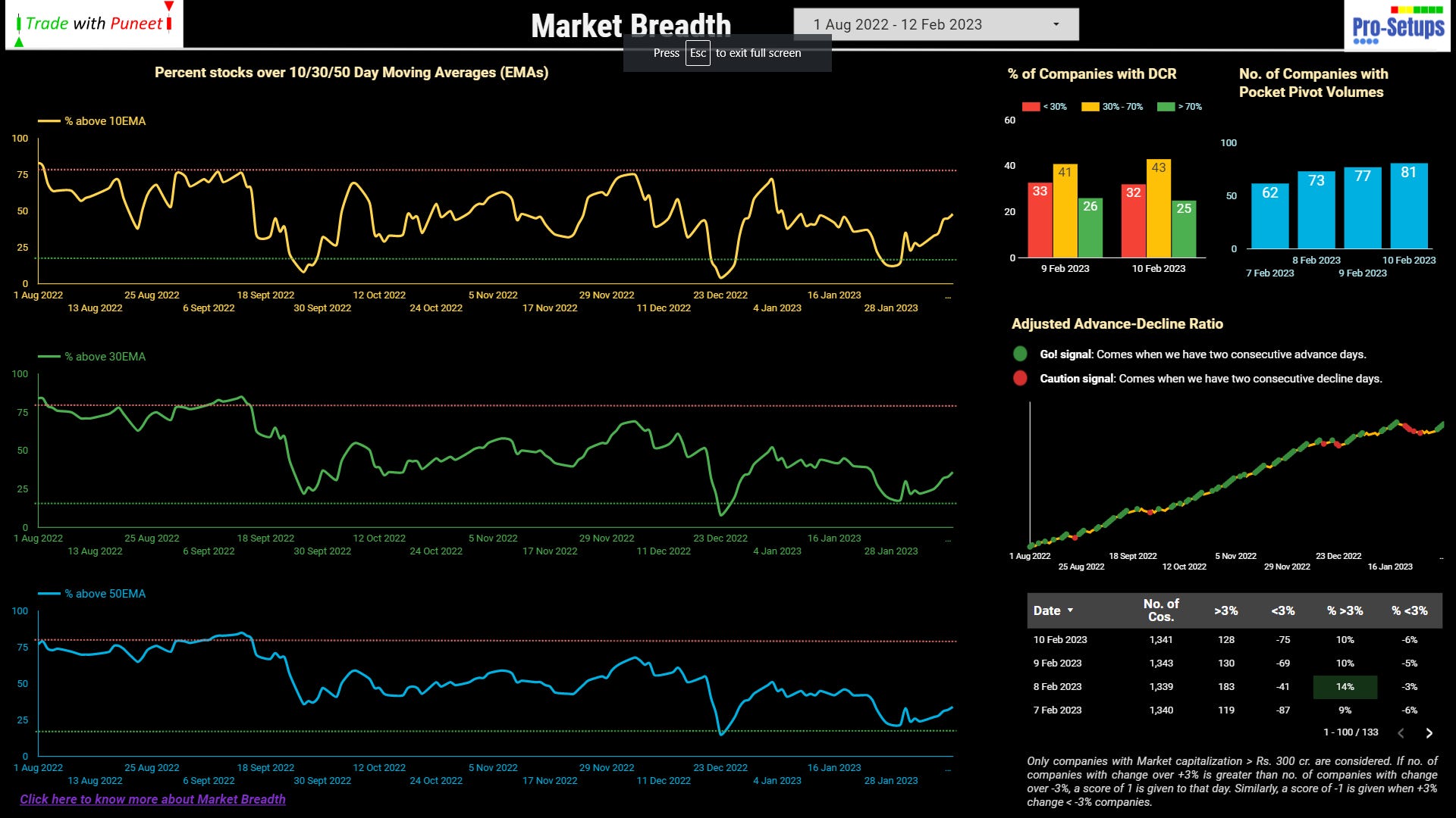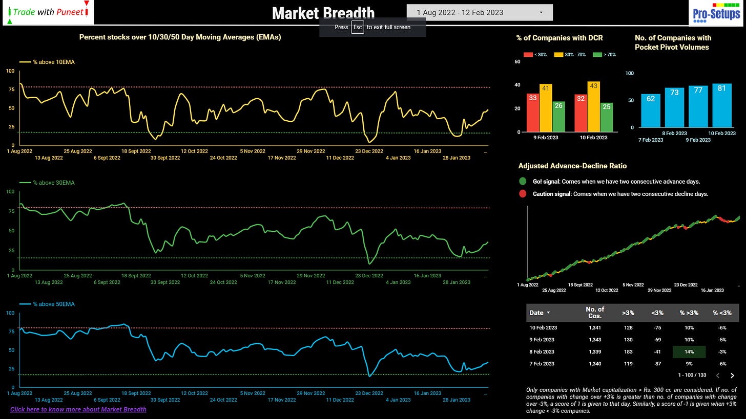 We are on road to recovery from January’s last week sell off. The percentage of stocks above key short-term moving averages are inching up gradually. The number of stocks with pocket pivot volume candles are also gaining traction.