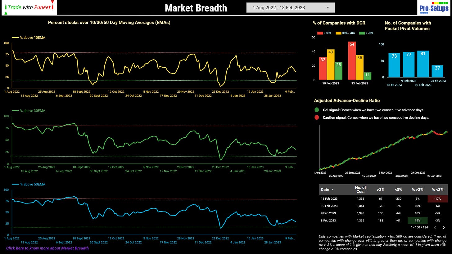 Sharp drop in the number of stocks giving pocket pivot volume candles. The % of stocks above key short-term moving averages are inching up, although there seems to be a pause again. We are probably in a stage, where traders with tight stop losses will have to cut their position.