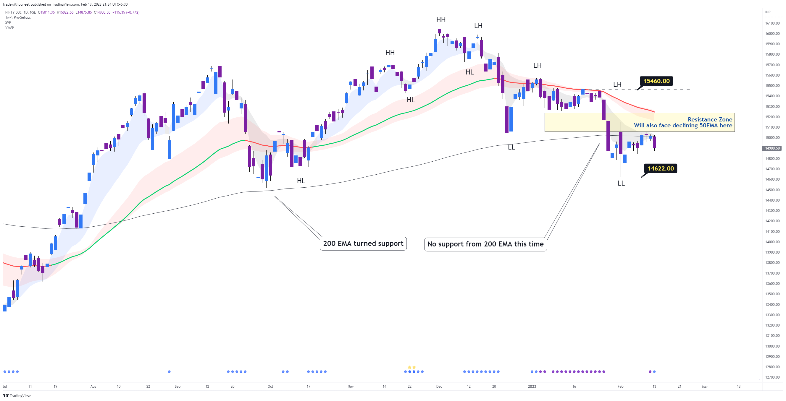 Forget about a date with 50EMA, even an affair with 200EMA is turning out to be a bad one. Even the budget day candle is getting hard to be taken over. We have started to fall, without even reaching the resistance zone. If we fall tomorrow, it will surely hit stop losses.