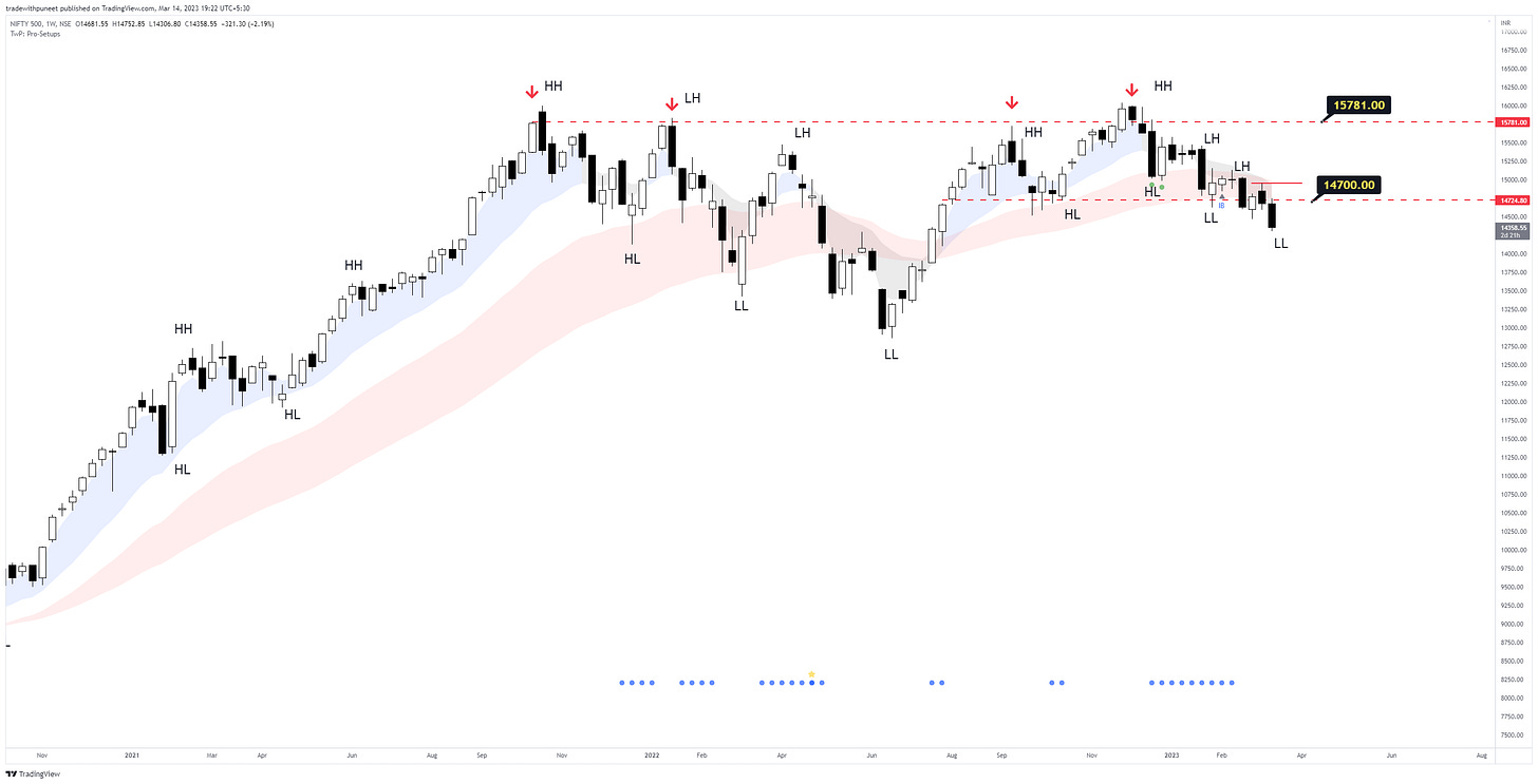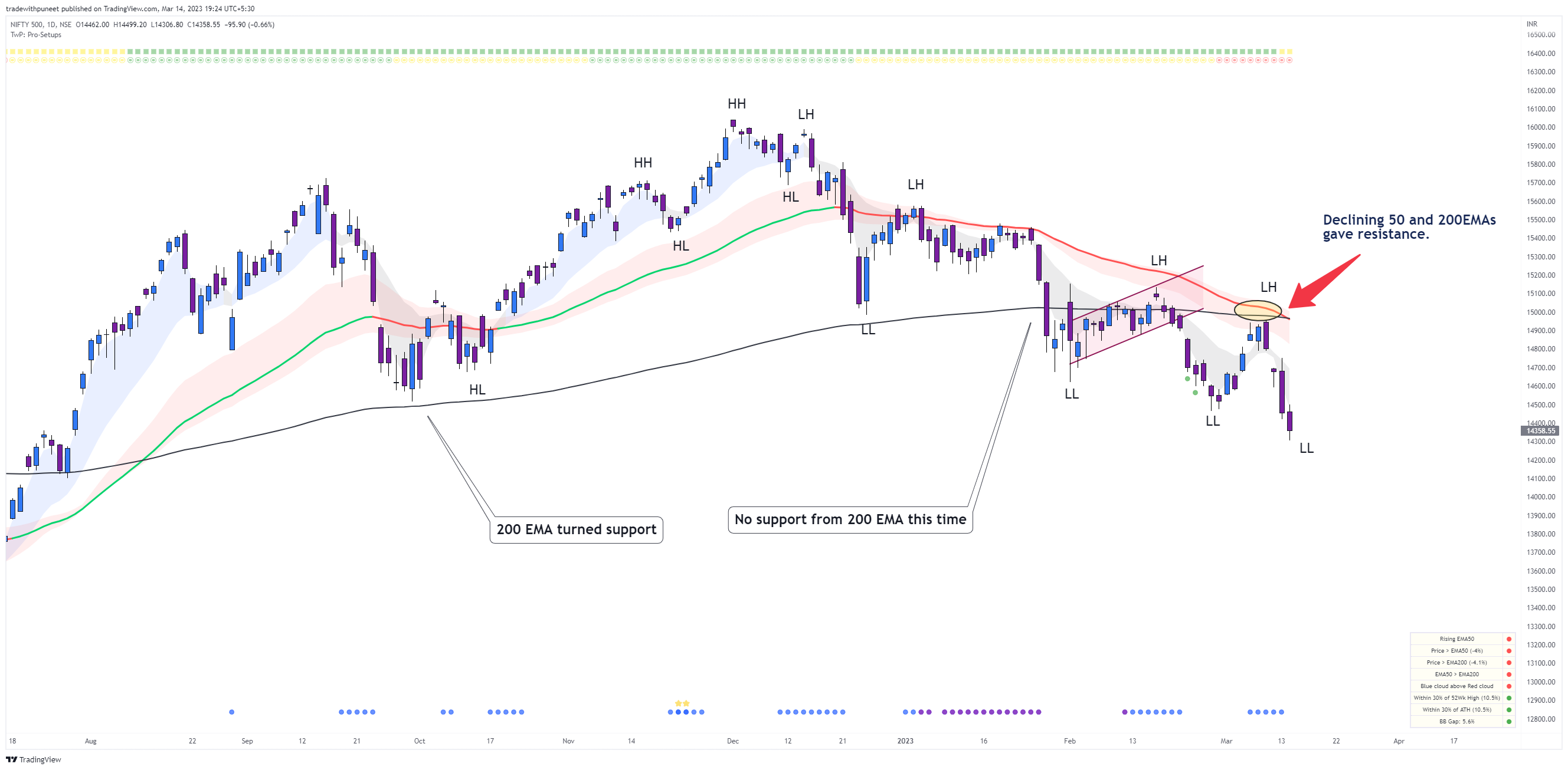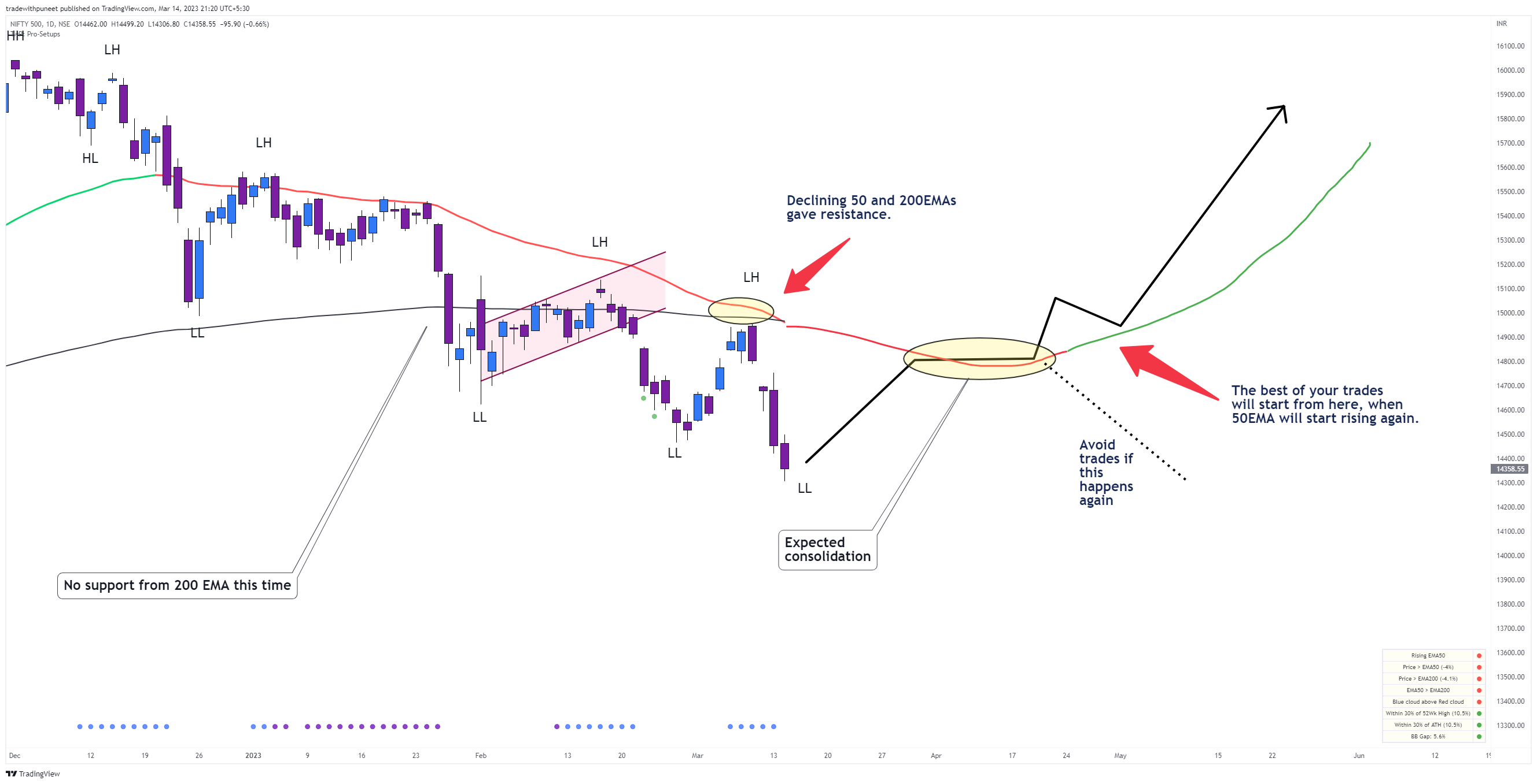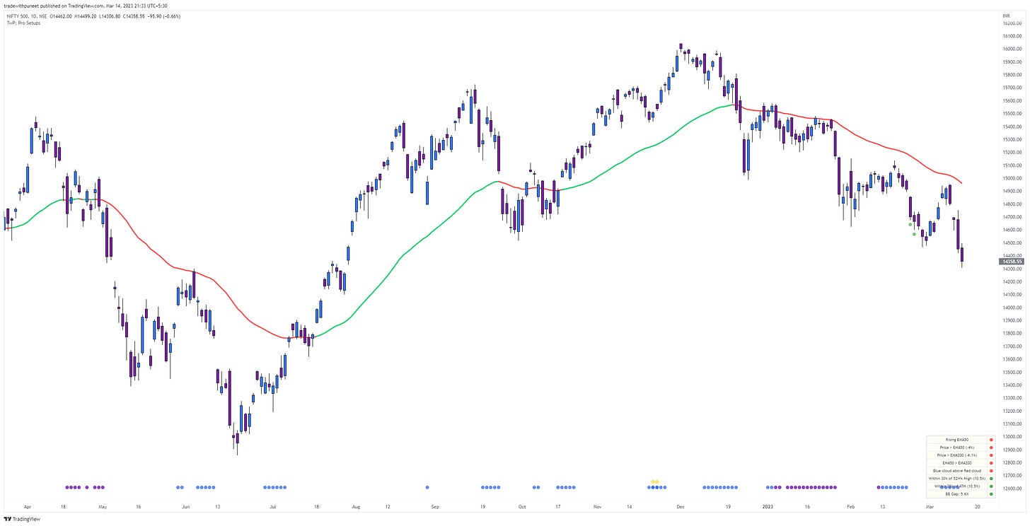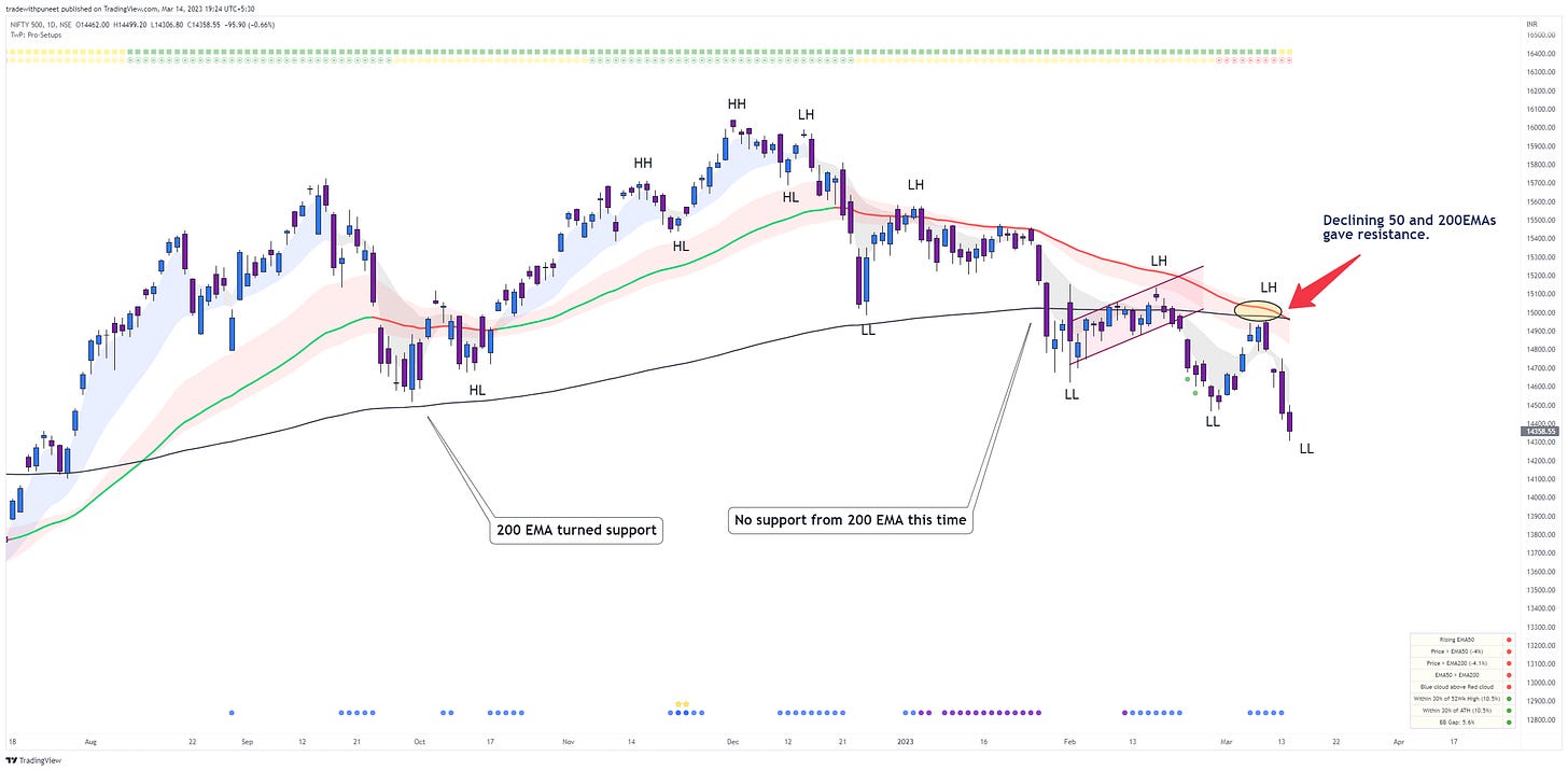In my previous market sense update of 1st March 2023 (click here to read), I talked of how we can face resistance from the declining 50-day EMA and whatever longs we are making should only be considered for trading bounces. That’s what actually happened. We had a rally till 8th March and then slipped.