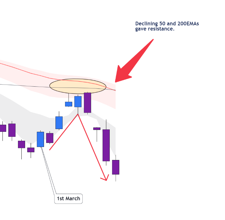 Daily timeframe chart: The support from 200EMA is long gone. We went near 50 & 200EMA (on 8th March), but both of them rejected our friendship offer. They are bullying us now.