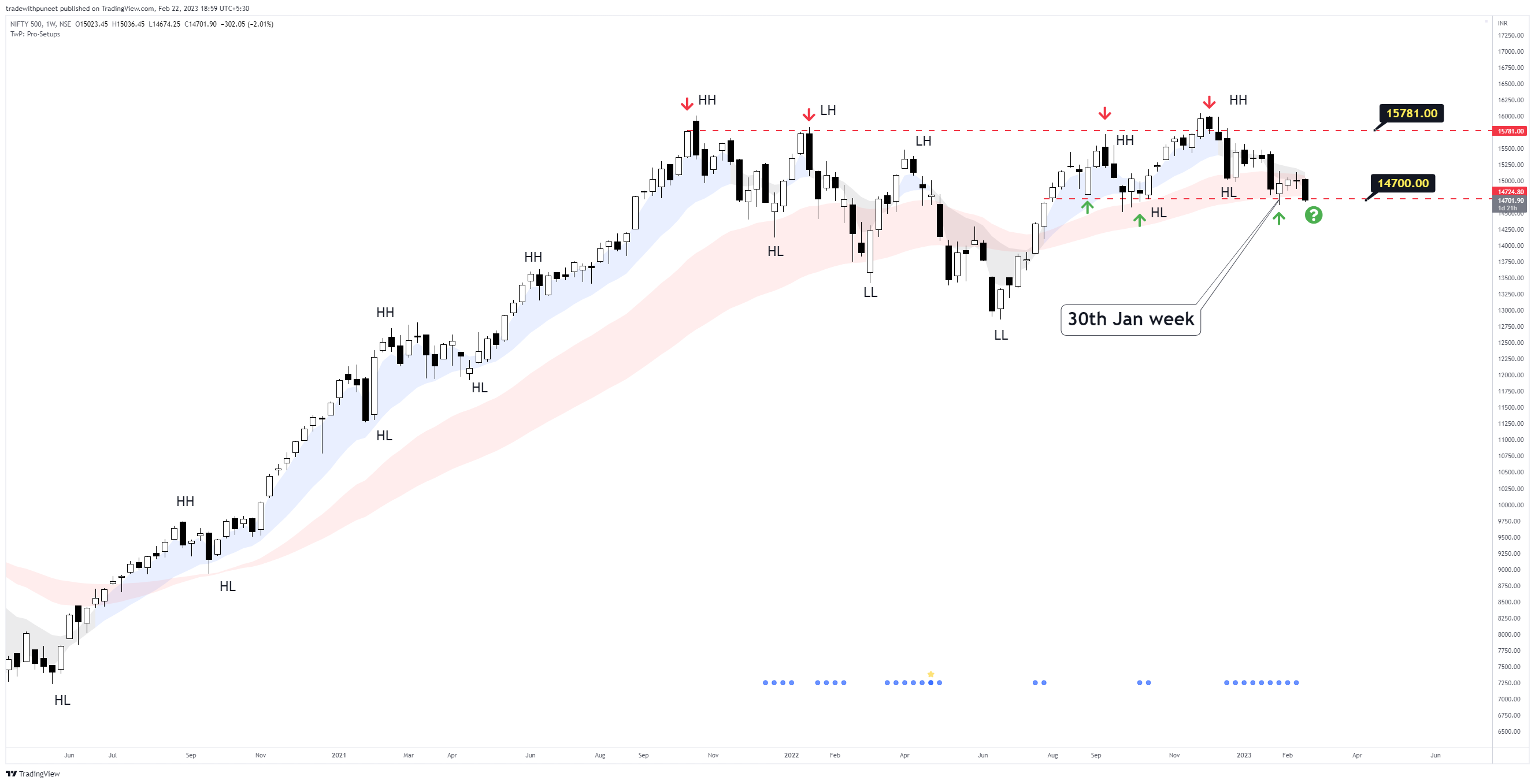 The week starting 30th Jan appeared that we had taken support at around 14700 levels. Last week was a doji with 50% WCR, which largely meant that we were in an indecision stage. We are also forming a mini coil, very similar to what we had from 26th Dec - 16th Jan which was followed by a 3% decline in Nifty500 in the subsequent week. This week appears to be doing the same, with a 2% fall already. We are again at around 14700 levels, and the chart is looking bearish as of today.