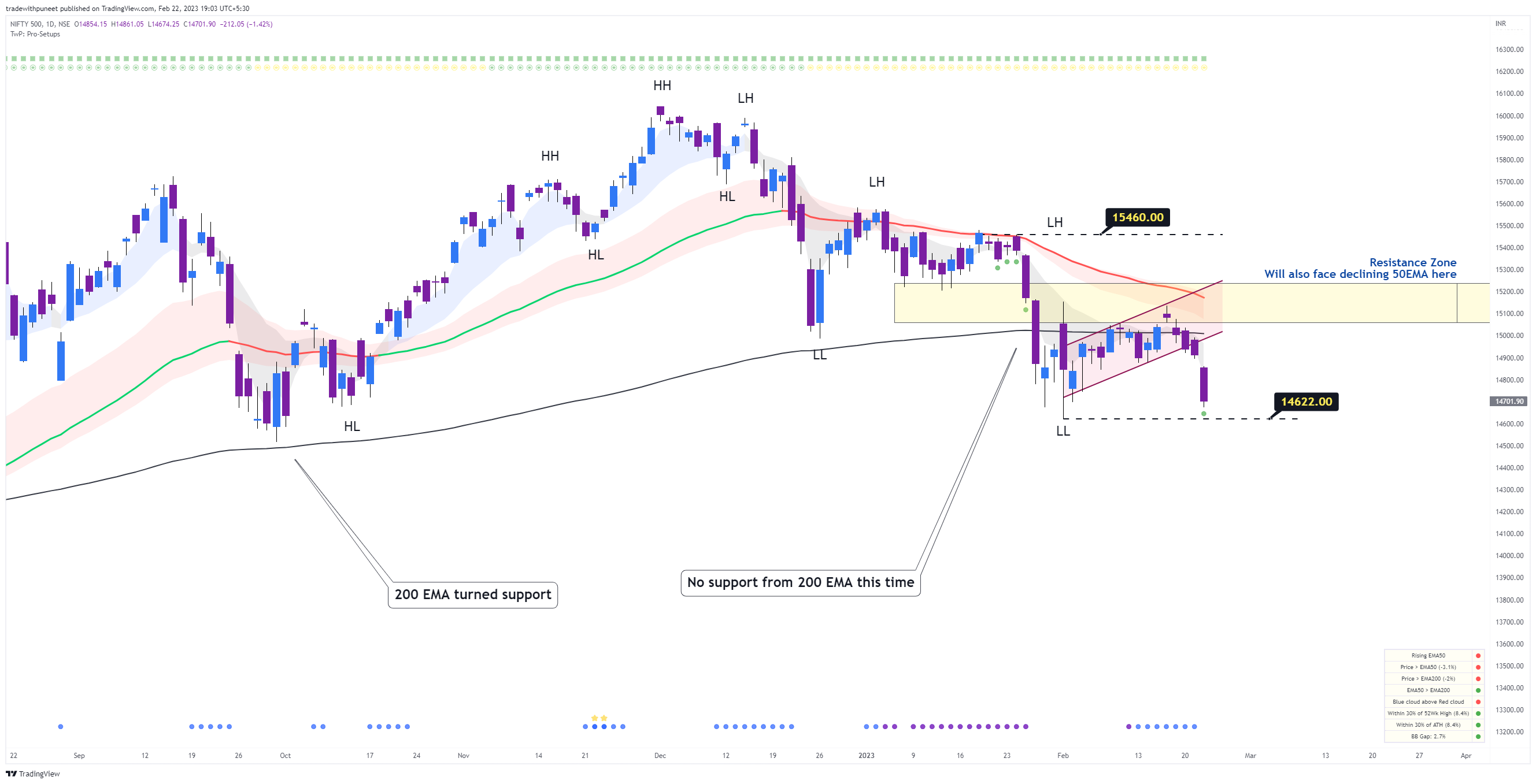 The support from 200EMA is gone. The bear flag that I mentioned in the previous update (click here to read it) is also broken. Next is the test of the budget day’s low. While Nifty managed to break the Budget day’s high and close above it, which was cheered widely by fintwit, same is not true for Nifty500.