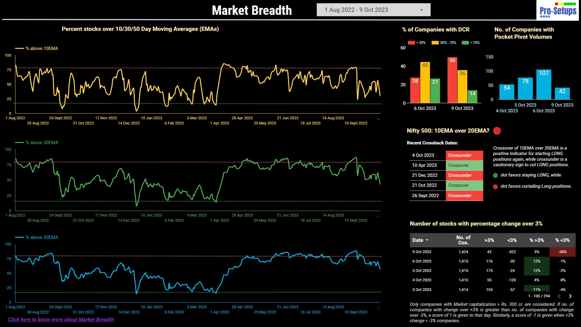 Nifty500’s 10EMA crossed over 20EMA on 10th April 2023, and we had a long period of favorable trading since then. Nifty500 is currently holding steady on the rising 50-day EMA, which is generally considered a positive and bullish sign. This suggests underlying strength in the market.