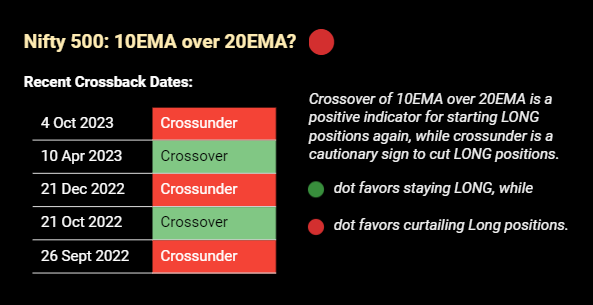 Answering that can be anybody’s guess. To answer that question objectively, we started to use 10EMA & 20EMA on Nifty500 chart in our Market Breadth page of the Dashboard. Simply put, we said that if Nifty500’s 10EMA is trailing above 20EMA, we stay long, and if 10EMA is trailing below 20EMA, we avoid long positions. You may read more about it here.