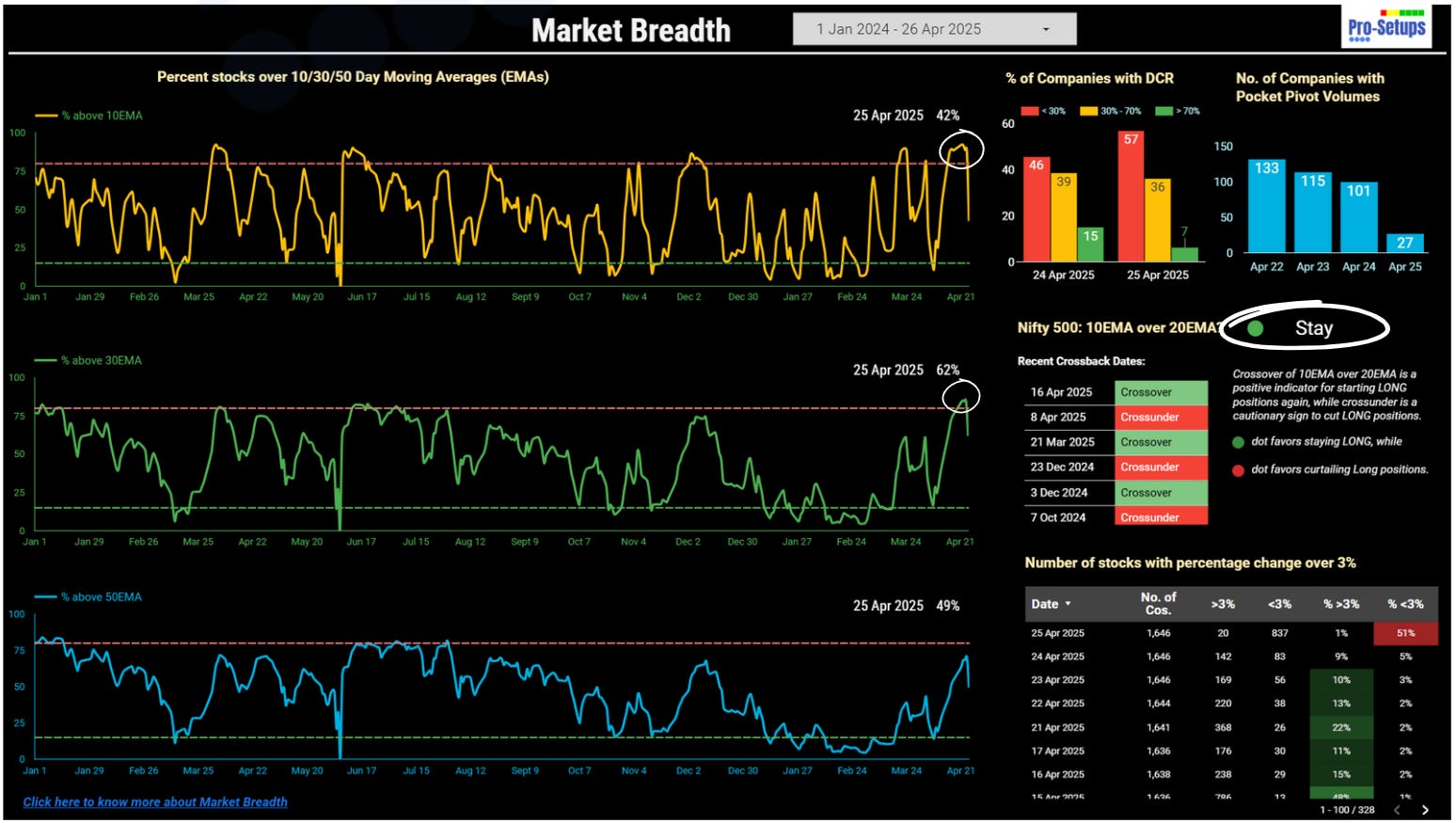 Market breadth cooled down from overbought levels this week, signaling profit booking that followed the robust rally. The % of stocks above 10EMA and 30EMA had reached the overbought zone during the week and fell sharply from there. We had crossover of Nifty500's 10EMA over its 20EMA last week, a positive sign for staying long, which stays in place. It needs to be seen whether the current pullback to 50EMA will be bought into or not.