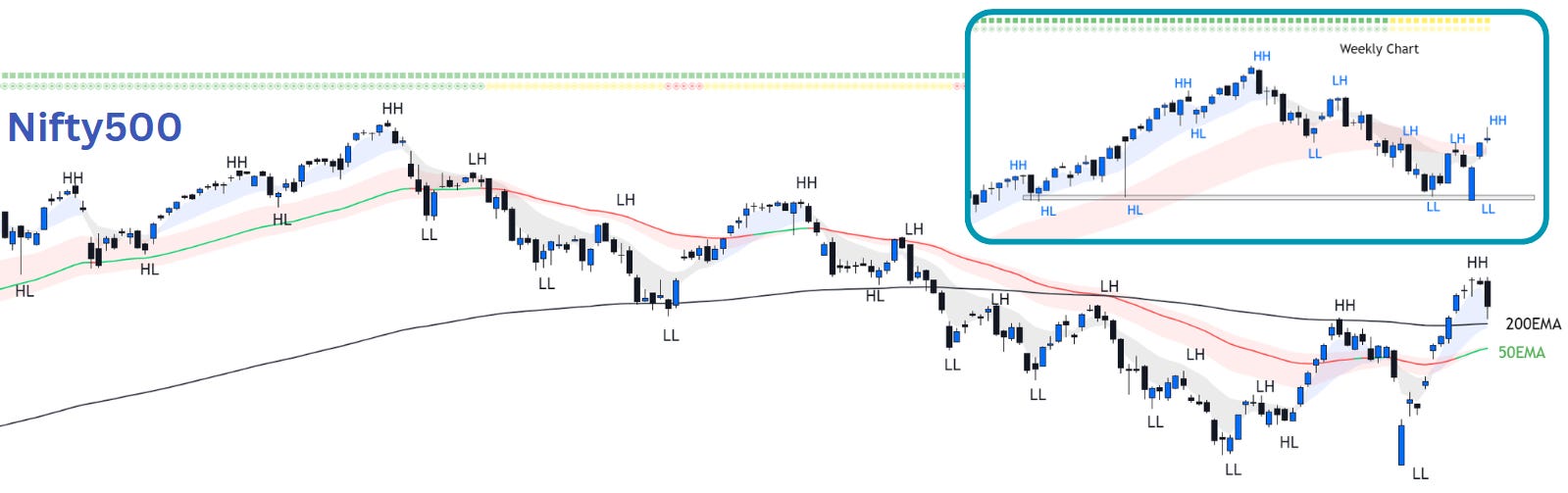 Nifty500 closed 0.77% positive for the week. The price action was largely positive in the first half, though some profit booking was seen on Thursday and Friday. It’s natural for markets to pause after a strong run. Our markets have rebounded impressively in last three weeks, suggesting a likely bottom has been established.
