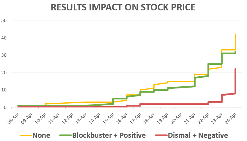 On the results front, while a Moneycontrol article highlighted sluggish Q4 earnings growth in its April 25th article, according to us the market reactions to reported results have been broadly positive. In fact, more companies have seen positive or blockbuster reaction post-results than those facing negative or dismal impacts. This indicates the market may have already priced in the muted earnings expectations, leading to a more optimistic response. The data sample is still small as we have just started with the earnings season, but the initial trend is encouraging.