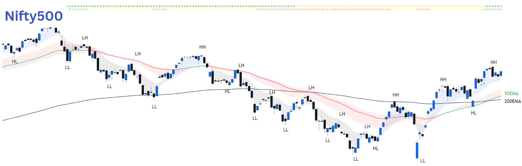 Nifty500 ended the week with a modest 0.39% decline, despite slipping over 1.2% midweek. After a strong month-long rally, some profit-taking was expected, but the broader trend remains upward. We continue to follow this trend until clear signs of reversal emerge. At Pro-Setups, we emphasize the importance of the rising 50EMA. By staying in the market when Nifty500's 50EMA is rising (green) and avoiding long positions when it is declining (red), swing traders can significantly improve their returns (read our blog on this topic). Combine it with the crossovers & crossunder of 10EMA & 20EMA to get Stay & Cautious signals. That's a simple hack.