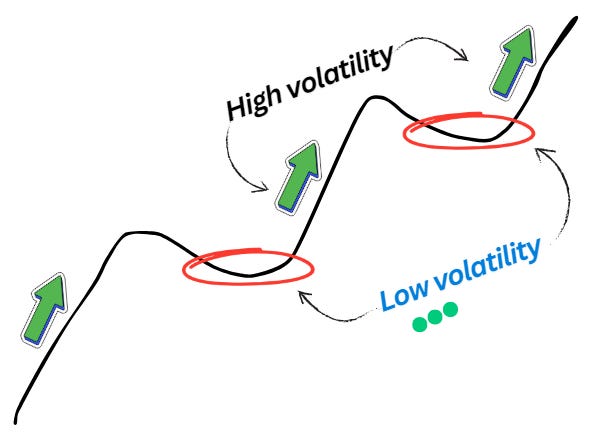 Low volatility period is when price moves within a narrow range and exhibit minimal fluctuation, whereas during high volatility period, price experiences significant fluctuations and large price swings.