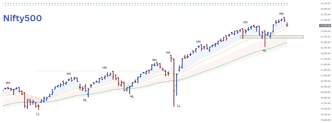 Nifty500 continued its strong momentum, hitting All-Time-High in 4 out of the 5 trading sessions, before global sell-off made it giving up all gains for the week on Friday. For the week, it closed flat. The reason why we talk of Nifty500 instead of Nifty50 is because the former represents over 90% of the listed market capitalization, while the later represents just 50%.