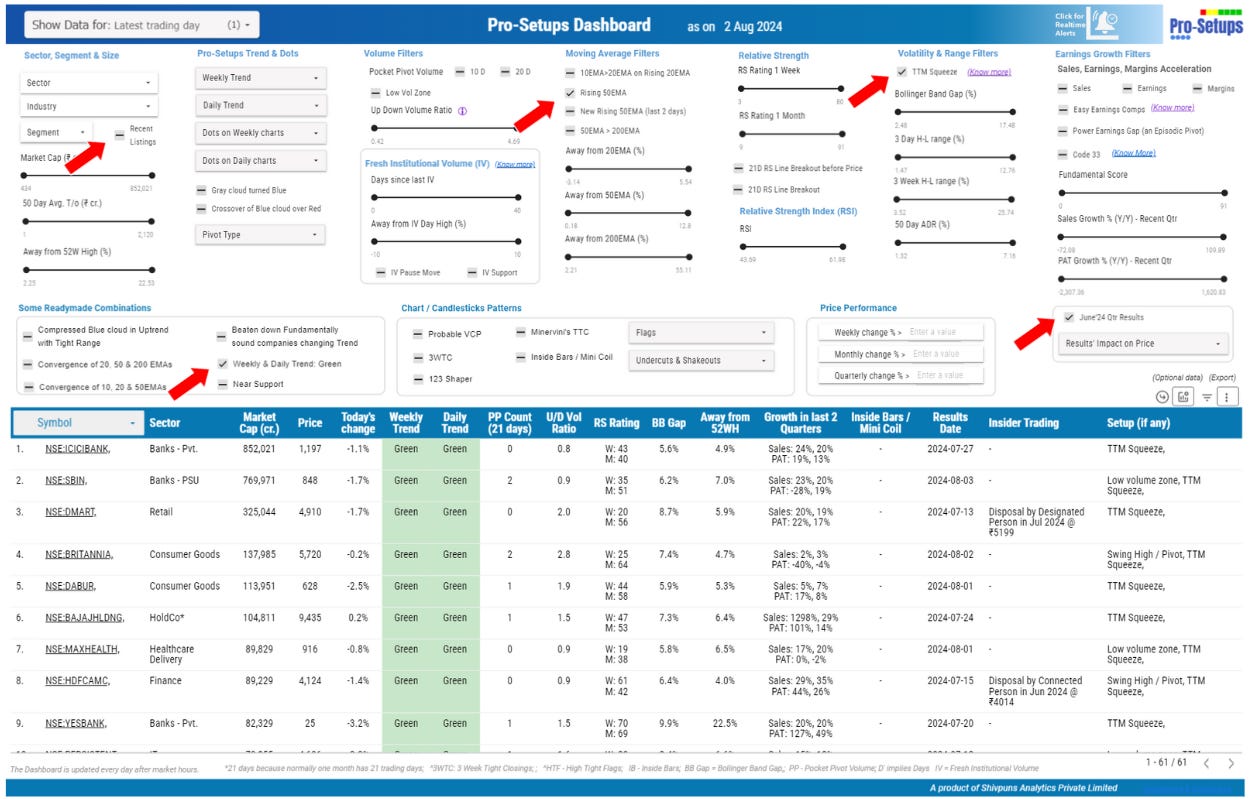 On selection of Green trend on Weekly & Daily timeframes, all Recently Listed stocks were removed from the Screener results because of their limited trading history. Hence, we reset the Screener page, and choose following filters: