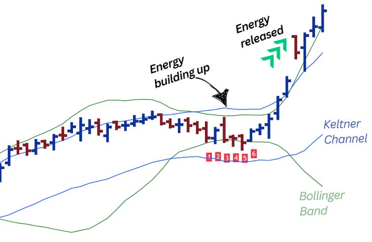 In the chart on the left, when the green channel (Bollinger band) is inside the blue channel (Keltner channel), it is said to be TTM squeeze.