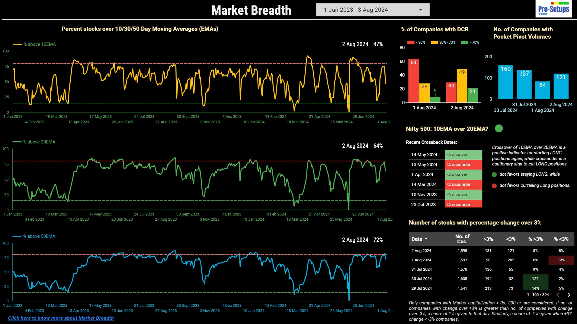 Although still strong, market breadth weakened this week, with %age of stocks above 10EMA falling below 50%. %age of stocks above 20EMA and 50EMA have also started to come down this week from their overbought/bullish zones.