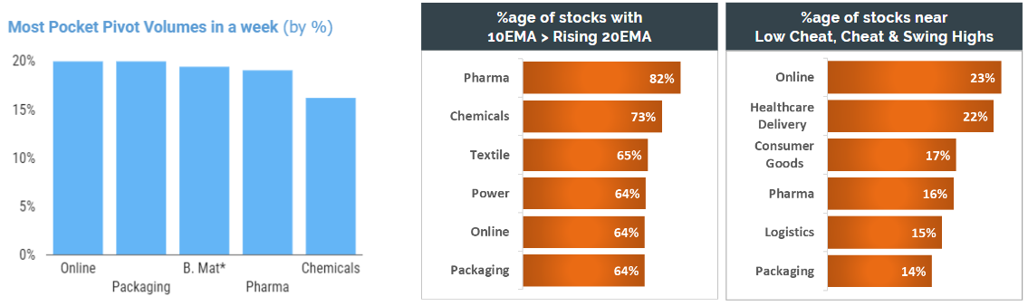 Going by volume, Online & Packaging sectors top the charts with highest average pocket pivot volumes in the week. Over 20% of stocks in Online and Healthcare Delivery sectors are near their Low Cheat, Cheat & Swing Highs levels.