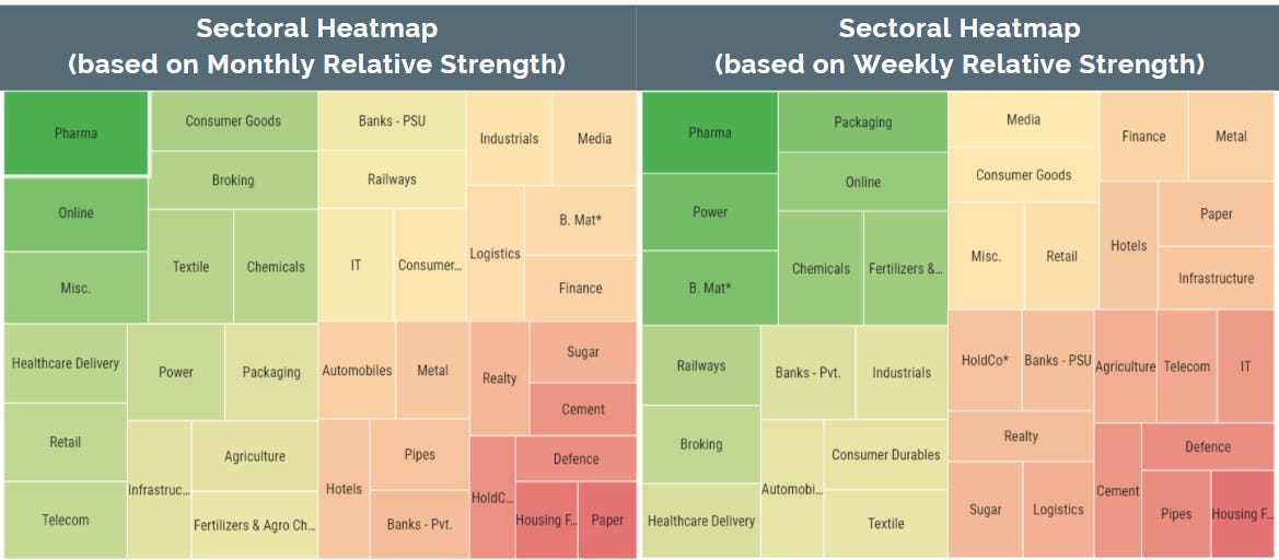 Sectors that are dark green on both heatmaps (top-left corner) are the strongest sectors that have performed on both timeframes. Pharma continues to lead the pack this week as well. Any pullbacks here in strong names can be considered as buying opportunity.